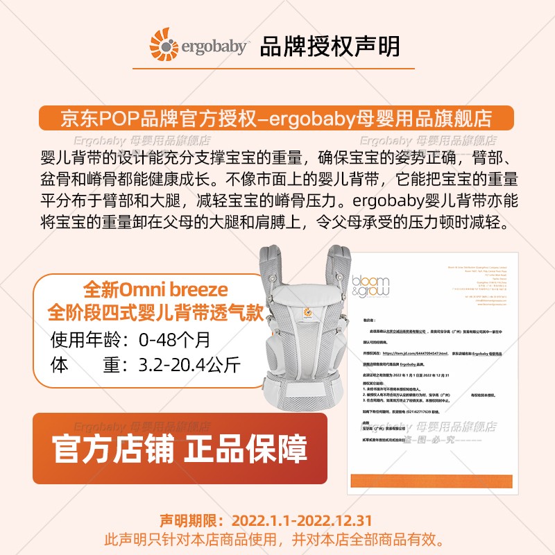 ergobaby breeze系列 四式婴儿背带 透气款 升级版,更加舒适透气、柔软,轻松抱娃解放双手,使用背带会让宝宝髋关节充分打开,ergobaby背带功能性强大,获得多项国际大奖,具有国际髋关节协会的认证,同时竖抱利于呼吸消化,减轻新生儿肠绞痛情况。