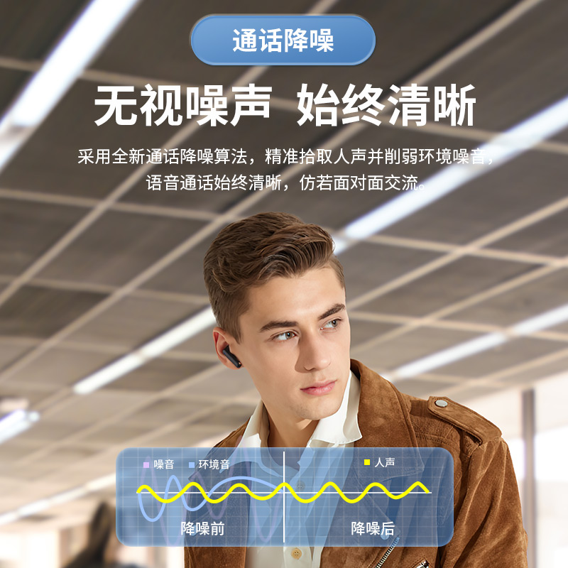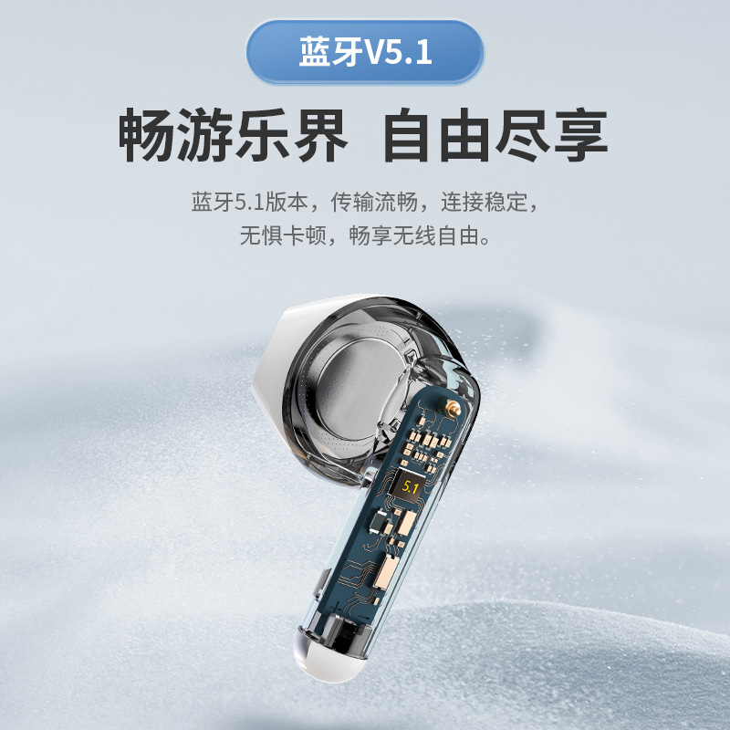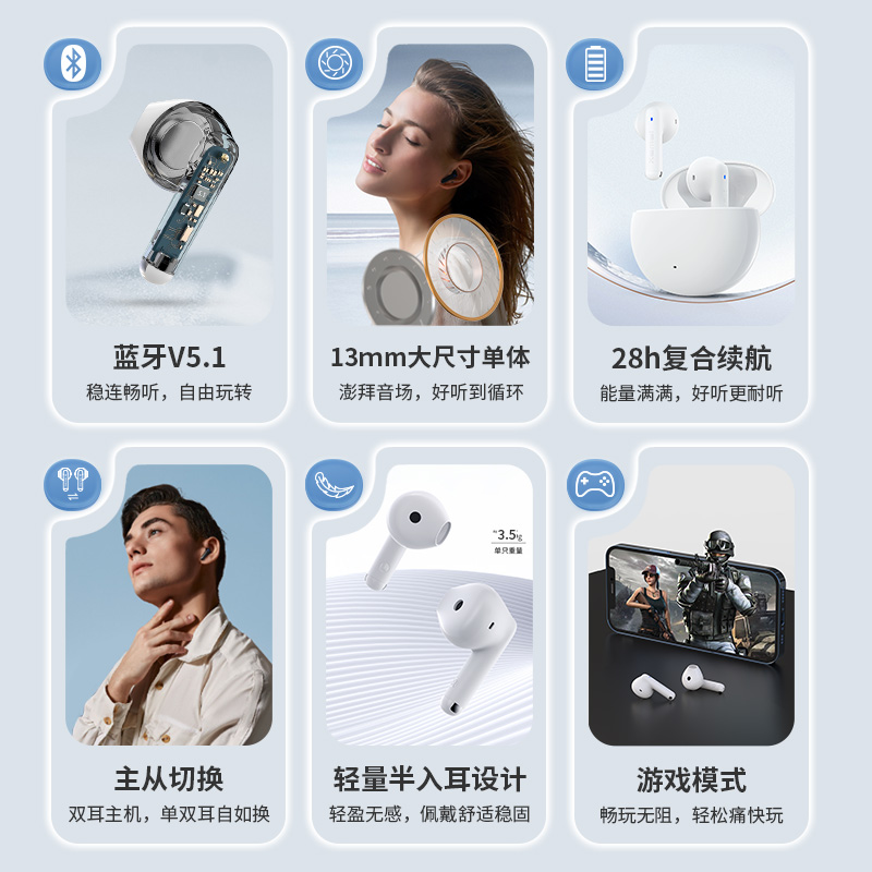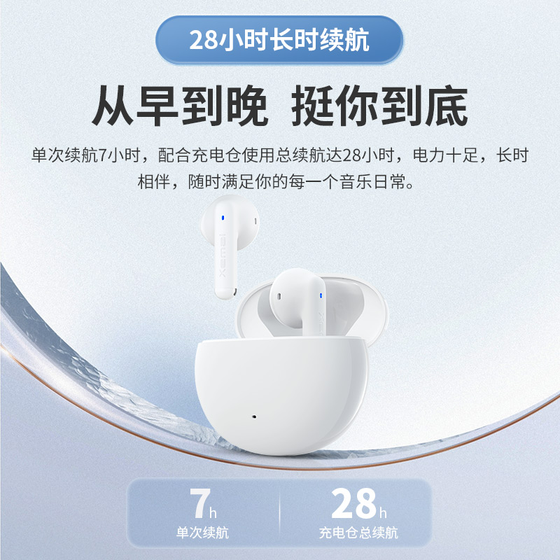 采用 13mm 大尺寸单体,小巧身材,单次续航 7 小时,配合充电仓使用 ,拥有 28 小时长续航,单双耳无缝切换。采用全新通话降噪算法,精准拾取人声并削弱环境噪音,配置蓝牙 5.1 版本,IP54 级防尘防水。外观采用契合耳朵曲线的半入耳式人体工学设计,单耳轻约3.5g,零压迫更自在。