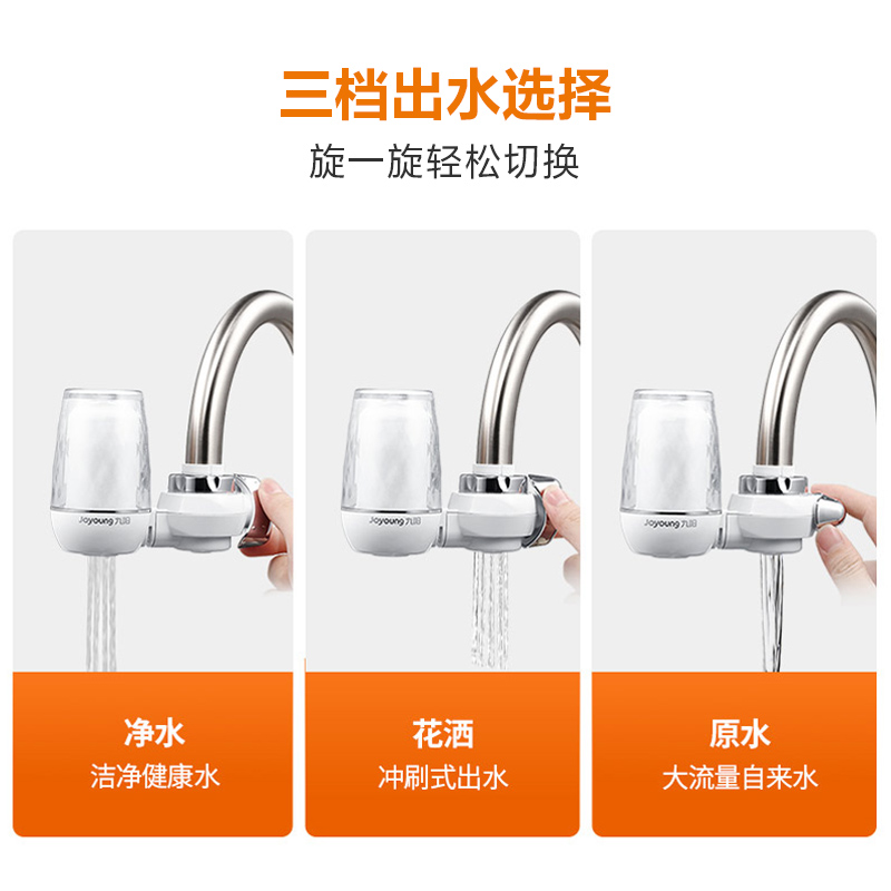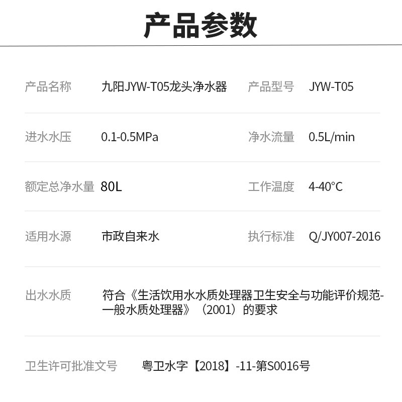 这款Joyoung 九阳 JYW-T05 水龙头台式净水机,升级全透明机身,滤芯状况看得见。原装四芯,两年套装。加大加粗滤芯,过滤面积增多,真材实料用料足。5重过滤,健康好水,滴滴纯净。三档出水,旋一旋轻松切换。适用龙头直径15.22mm的水龙头。净水流量0.5L/min,额定总净水量30L。