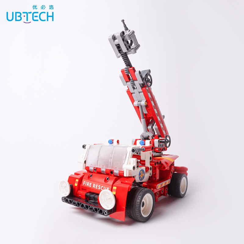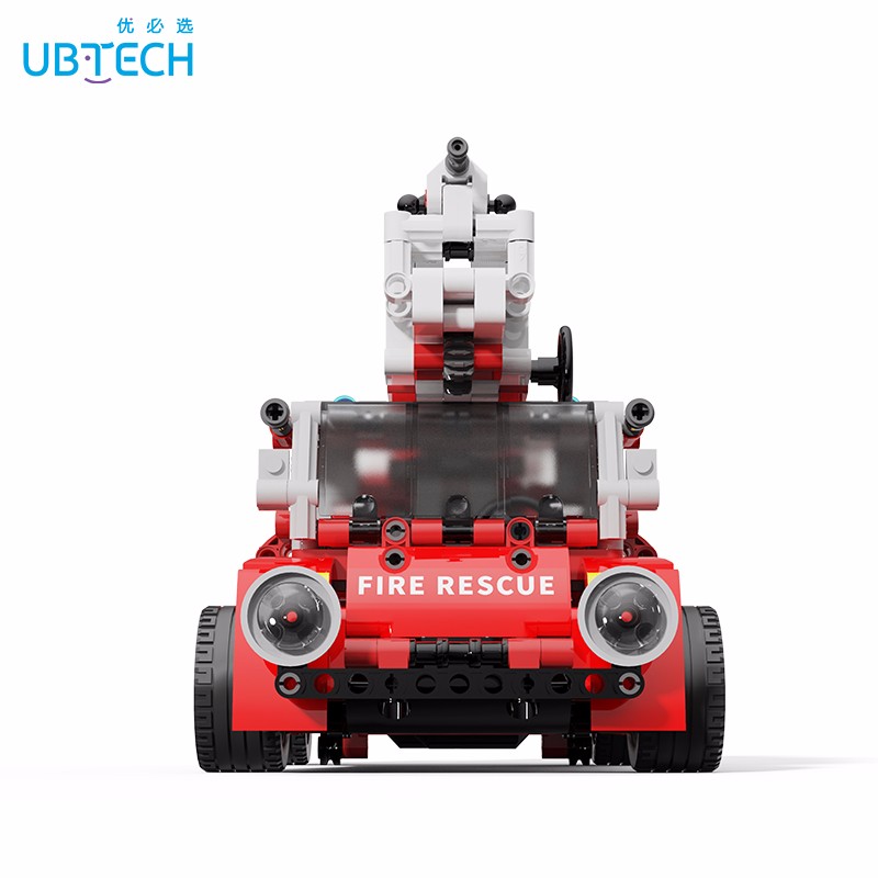 消防车智能编程机器人配置可手动机械控制伸缩式云梯,云梯升起的最大高度 25cm,最大升起角度 45°,可进行 90° 旋转。在拼接时,可在智能设备上通过 3D 立体搭建图纸,方便智能快捷。可在智能设备上进行操控,多端智能操控。配有 530+PCS 零件,内置 500mAh 锂电池。