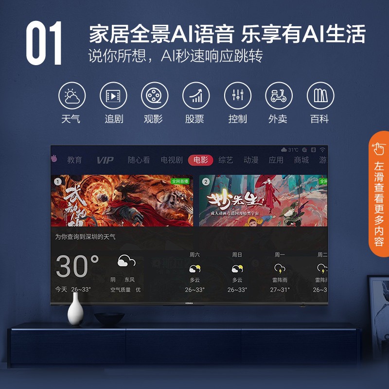 康佳U5系列液晶电视拥有100%BT.709色域,采用屏幕贴合技术,边框更窄,视觉效果宽广,康佳12bit色轮引擎,支持HDR技术,细节色彩丰富,支持杜比解码音效,搭载A73架构华为海思芯片,满足系统流畅运行,YIUI支持语音操控,可熄屏听歌,相当实用。
