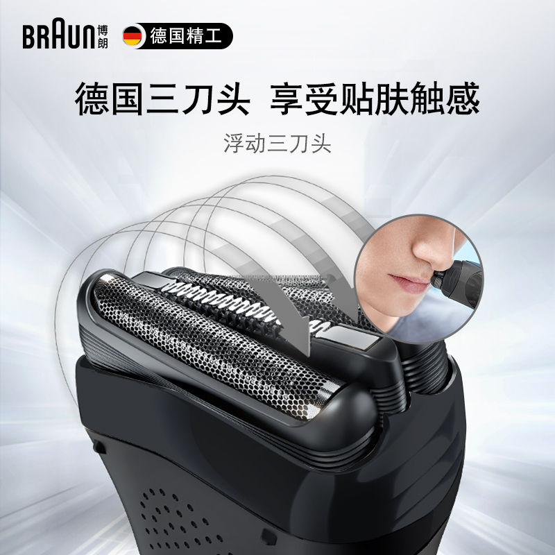 这款型号为3000TS的博朗电动剃须刀采用独立浮动三刀头,可以更好的适应面部轮廓,贴合面部曲线及死角。搭配精密梳齿技术,可以理匀杂乱胡须,一剃即净,减少反复回刮。机器全身可水洗,支持5分钟闪充剃,1小时充满电可使用45分钟。