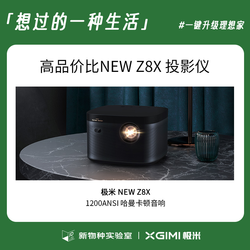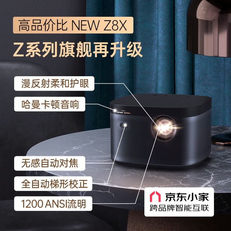 这是极米Z8X的升级机型,其在外观上与前代Z8X变化不大,依然采用经典的黑金配色,与家庭风格相容。核心参数上,采用主流0.33DMD显示芯片,分辨率为1080P,亮度为1200ANSI,保证视觉感受。新Z8X增加全自动梯形矫正,搭配新升级的无感自动对焦,投影的安装位置可以更加随意,侧投也有方正画面。 X-VUE画质引擎搭配MEMC运动补偿,观看高清动作大片和体育赛事更加流畅,HDR10+HLG双解码,画面明暗对比更强,层次更加分明,可展现更多细节。NEW Z8X内置harman/kardon哈曼卡顿音响,音腔体积较Z6X提升350%,并且支持待机蓝牙音箱功能,一机两用。 NEW Z8X内置的INUI智能系统,支持有线、无线同屏,安卓、iOS、MacOS可无线同屏,AI智能语音功能,搭配遥控器可实现语音控制,另外该机无广告,开机6秒可进入系统。