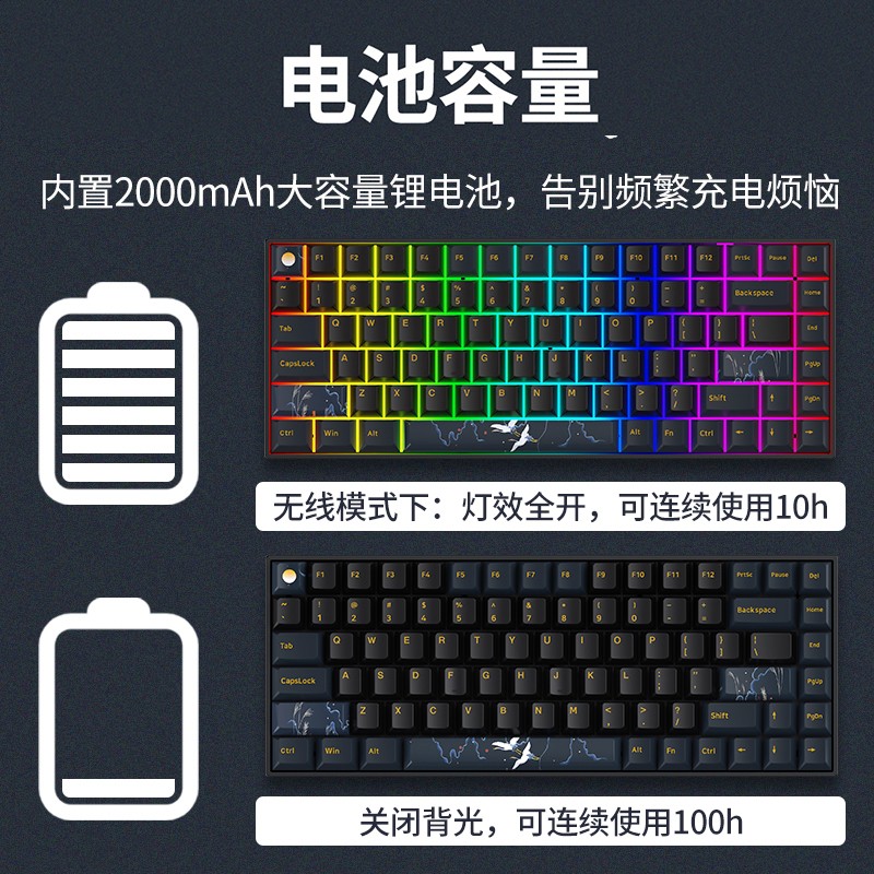 键帽采用原厂高度,与手指腹弧度相吻合的凹面弧型键帽,减轻敲击时指腹压力感,手感舒适、出众。键帽+采用双色热升华工艺,黑蓝配色,简约时尚,附赠四颗热升华键帽,提升产品个性。选用优质的定制机械轴体,触发响应迅速,回弹顺滑,有G黄PRO、G银PRO、BOX白、BOX红四种轴体,四种手感可选。