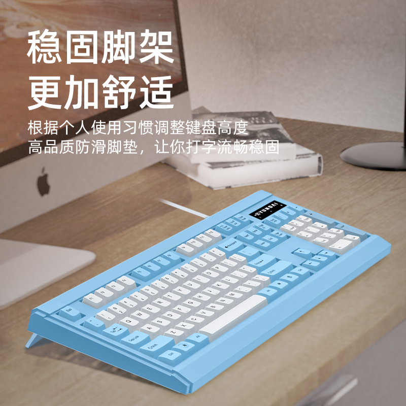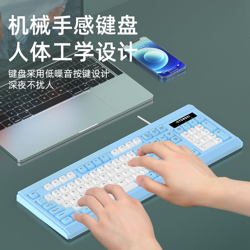 现代影音 KM10 键鼠套装,键帽采用拼色按键,字符不易磨损,手感更加细腻,键盘采用低噪音按键设计,深夜不扰人,轻盈的打字手感体验U型键帽,高清字符设计,键帽更清晰耐用,键盘采用防水防溅密封设计,无需安装驱动,只需将连接线正确插入USB端口,即可使用,支持各种台式机,笔记本电脑,尺寸453x165x37mm,按键寿命约1000万次。