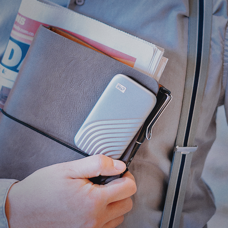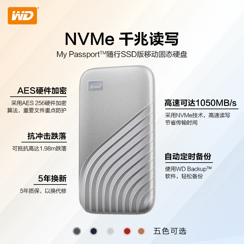 My Passport SSD“随行”SSD版外形紧凑纤薄,尺寸为10 x 5.5 x 0.9cm,重45克左右,非常容易收纳和随身携带。机身是全金属材质打造,整体比较圆润,尾部还有流线型凹印处理,具有不错的耐用性,可抗1.98米垂直跌落冲击。内采用SSD固态硬盘,支持USB 3.2 Gen 2高速传输,最高可提供1050MB/s读取和1000MB/s写入。另外,支持256位AES加密,兼容Win和Mac设备,即插即用。另外,还可通过专用程序快速备份和云备份数据,关键是提供了让人放心的五年质保。