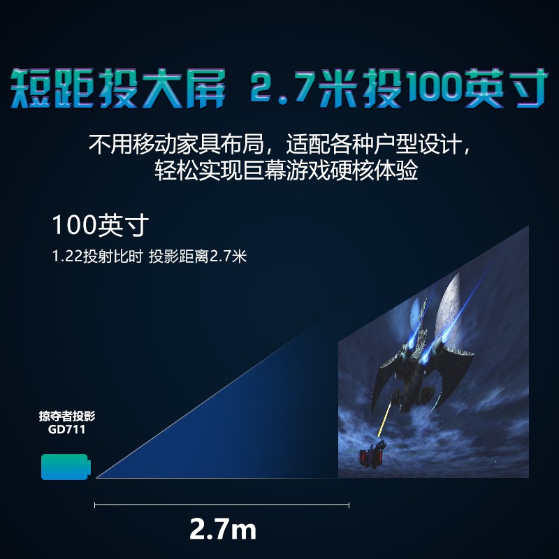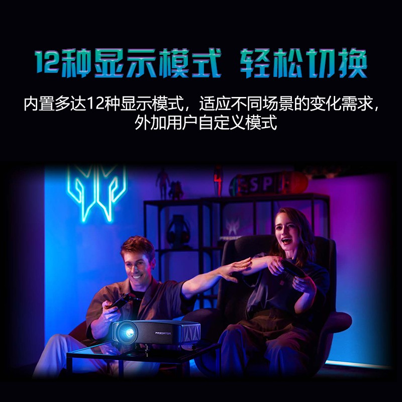内置多达12种显示模式,适应不同场景的变化需求,外加用户自定义模式,调节自己的色彩调配方案。四角画面校正摆放随自由,支持上下左右梯形校正,投影方式更加灵活多样,调整轻松又省心。1.22投射比时投影距离2.7米,短距离即可投出大画面,适配各种户型设计。