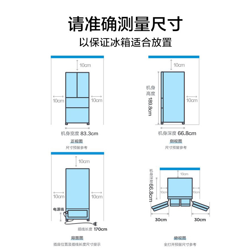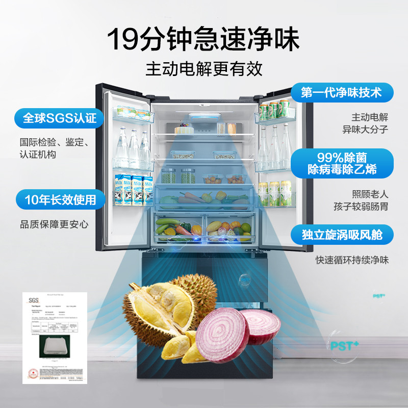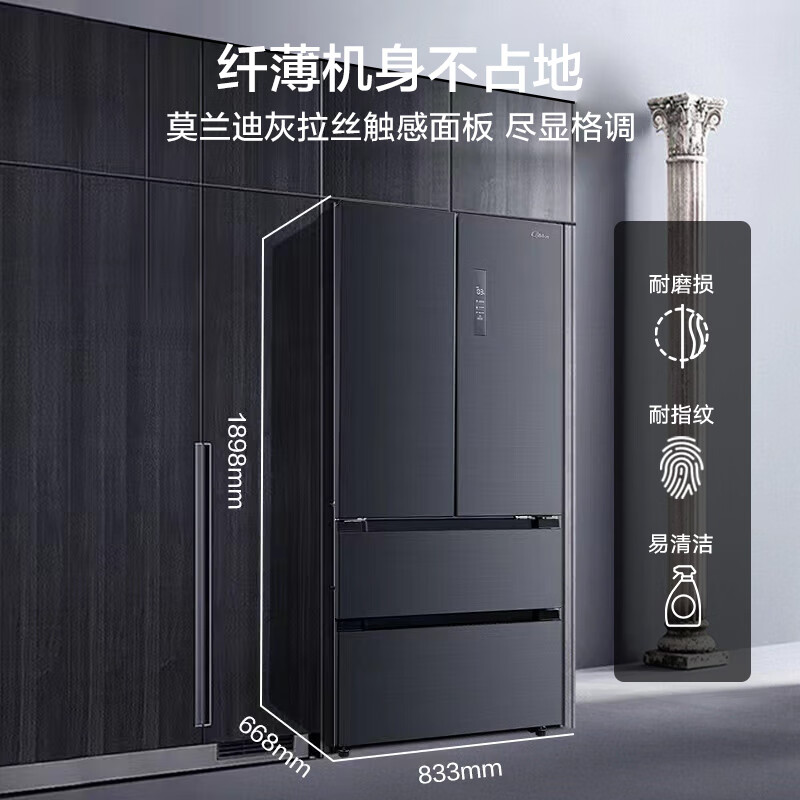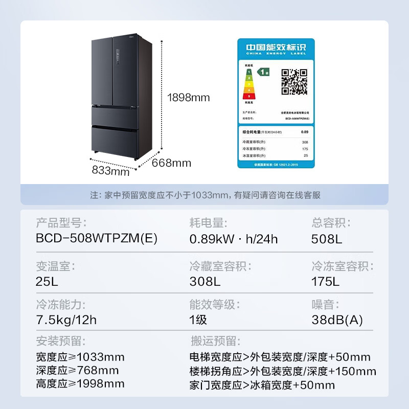Midea 美的 BCD-508WTPZM(E) 法式多门冰箱 508L ,莫兰迪灰雅致外观,PTS+超磁电离19分钟快速净味,温湿可控,四门三温区,冷藏室308L,冷冻室175L,冰温室25L,双层直开式抽屉,变频压缩机+风机,支持WiFi控制,耗电量0.98度每天,一级能效,冷冻能力7.5kg/12h。