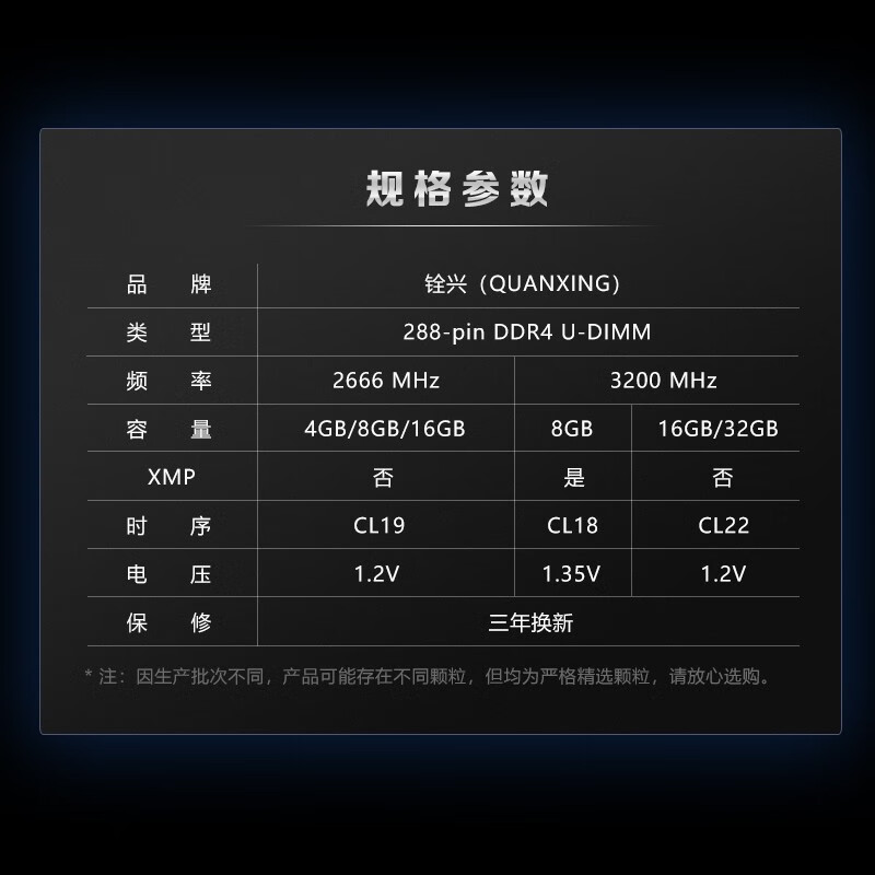 铨兴DDR4台式内存条严选优质颗粒,在生产过程中针对可靠性和兼容性进行严苛测试,兼容lntel和AMD两大平台,并向下兼容2400Mhz、2133Mhz,为系统的稳定运行提供有效保障。拥有2666Mhz高主频及CL19低延迟,大大提升系统响应速度,工作电压低至12V,省电同时大幅减少工作产生的热能。