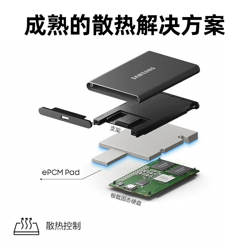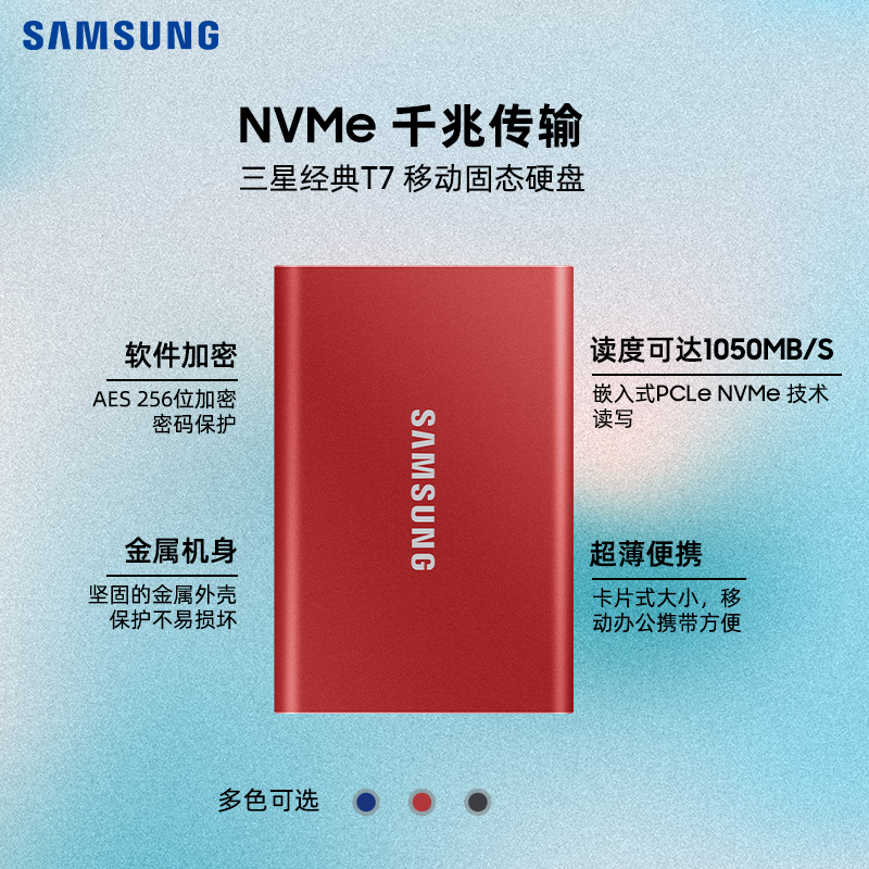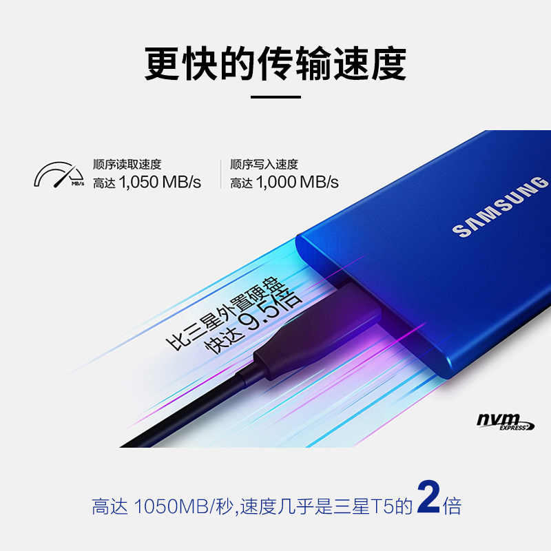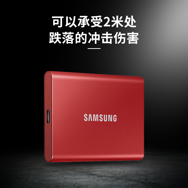 三星T7采用全铝合金材质打造,尺寸为85*57*8mm,重仅为58克。支持256位AES硬件级加密,此外,这次三星T7还具有不错的抗震性,可承受两米垂直跌落冲击。三星T7有500GB、1TB和2TB三种容量,最高连续读写分别为1050MB/s和1000MB/s。兼容性方面,可与PC、Mac、安卓手机/平板等连接。
