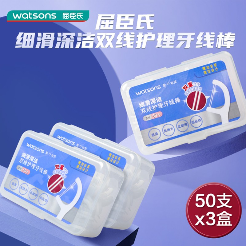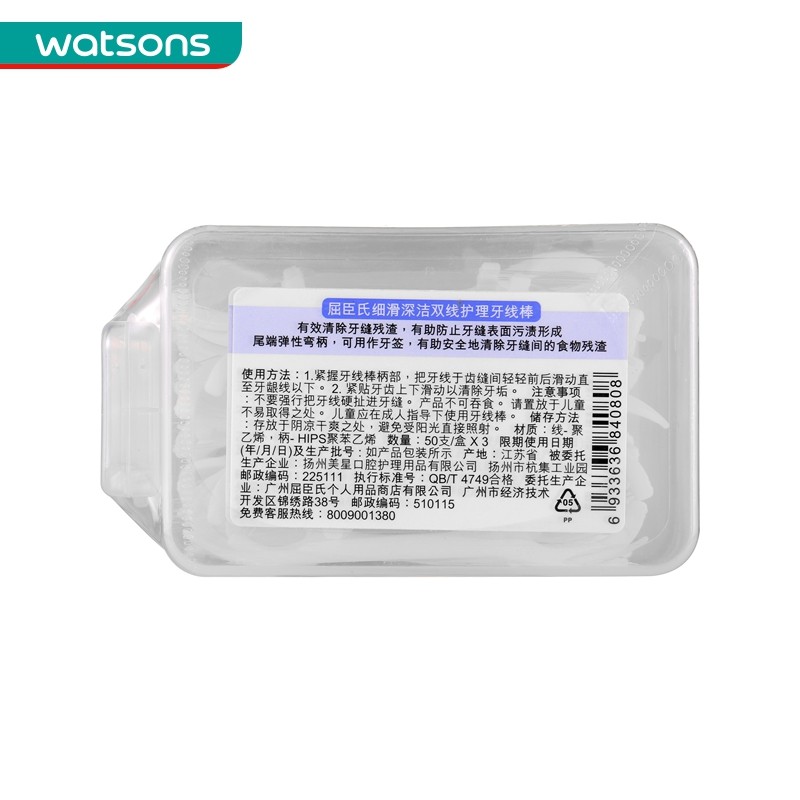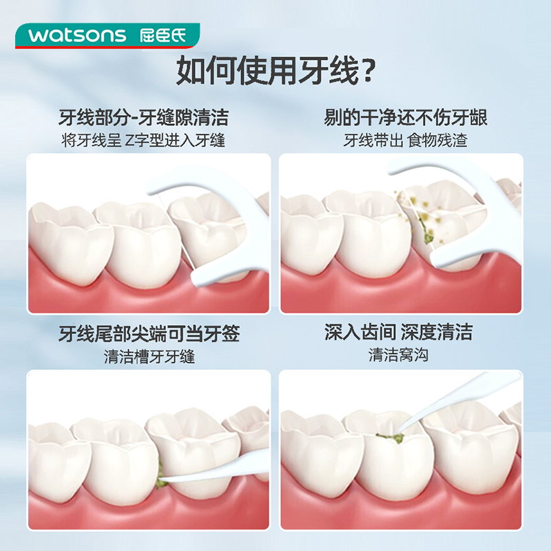 屈臣氏薄荷圆线多效护理牙线棒,弹性弯柄牙线不易断裂易于牙齿间滑动。此款牙线添加薄荷,让口气清新宜人。细滑线拥有高度顺滑感,能够轻松入齿缝,不易分叉。适合清洁狭窄齿缝间的牙垢与食物残渣,每天使用,保护牙齿。清洁齿缝,超细便捷~