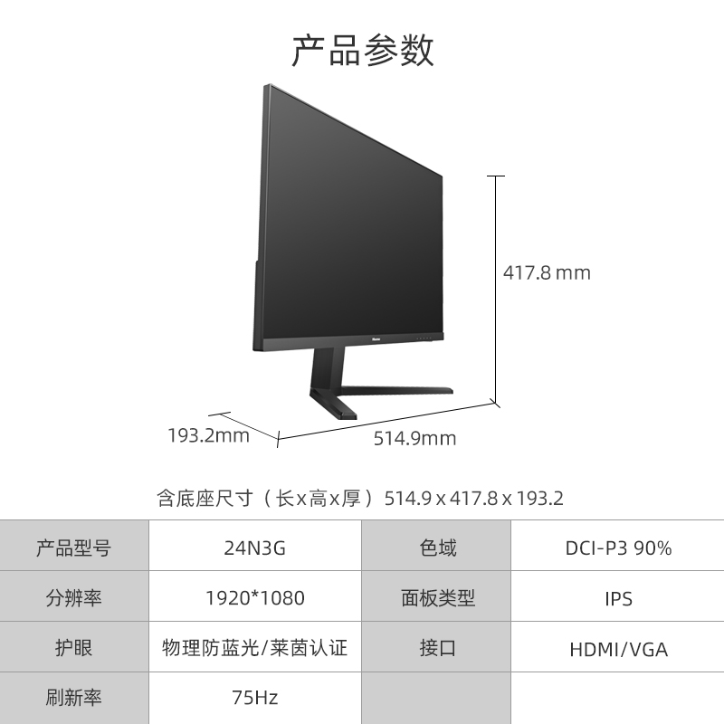 此款 海信 24N3G显示器搭载23.8英寸IPS屏,完美支持强大的色彩呈现力。178度广视角技术,更宽广的视野,每个角度观看均无偏色,搭配DCI-P3 90%影院级色彩,莱茵低蓝光认证,物理防蓝光守护双眸,75Hz刷新率,告别卡顿和拖影,精彩不失“帧”。