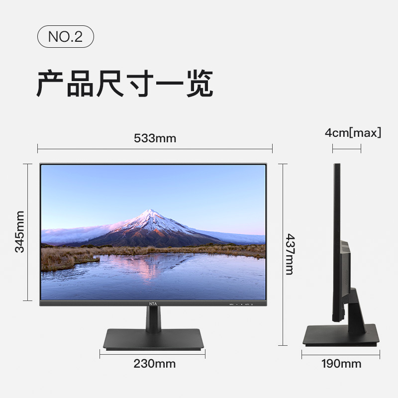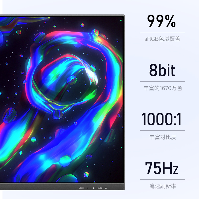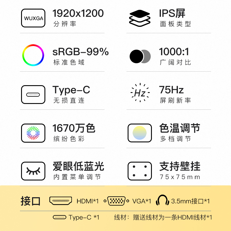这款显示器采用IPS面板,1920*1200分辨率,sRGB-99%标准色域,75Hz刷新率,支持75mm*75mm壁挂,接口有HDMI、VGA、3.5mm、Type-C接口。支持色温调节,爱眼低蓝光。