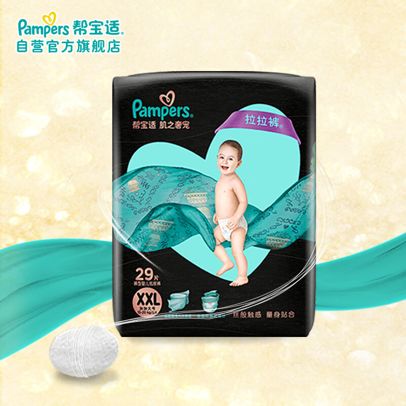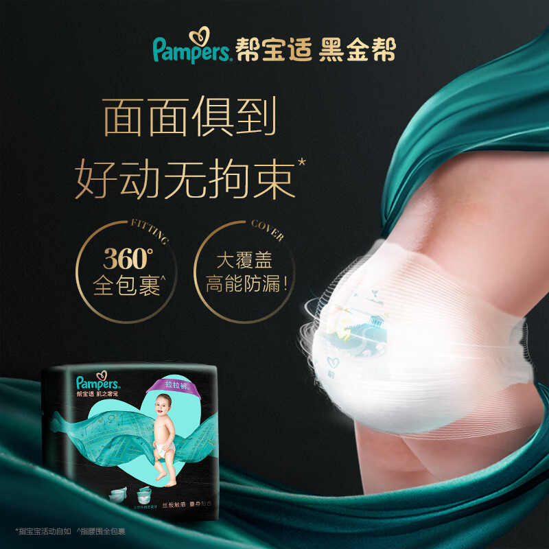 帮宝适是美国宝洁公司旗下著名的婴儿护理品牌,全球知名的纸尿裤品牌之一。旗下有一级帮、清新帮、纯净帮、绿帮等系列纸尿裤。本款肌之奢宠黑金帮系列是帮宝适2021年最新推出的首款含天然桑蚕丝的纸尿裤,天然桑蚕丝细至宝宝毛发的约1/2,让面层摸上去像丝绸般顺滑柔软,不摩擦宝宝皮肤不易造成刺激,茧型环抱设计像为每个宝宝量身定做一样,任何形状的屁屁都能轻松贴合,宝宝穿着更加舒适而且不易发生漏尿情况,叶脉导流表层加速尿液下渗速度防止回渗,同时还能排湿排热不易闷屁屁。包装上汲取了丝路灵感,融入敦煌、伊斯坦布尔、罗马艺术元素,灵动绚丽的漫画跃然“裤”上,高级感满满。