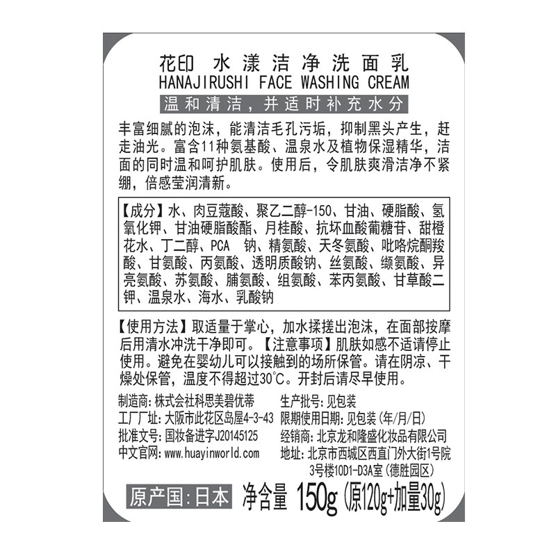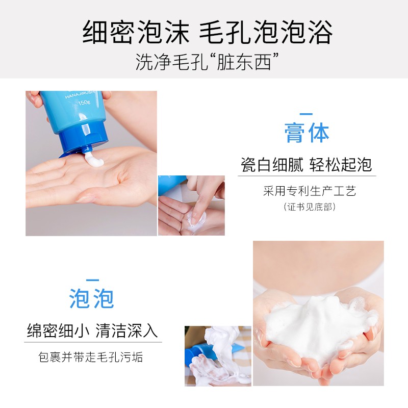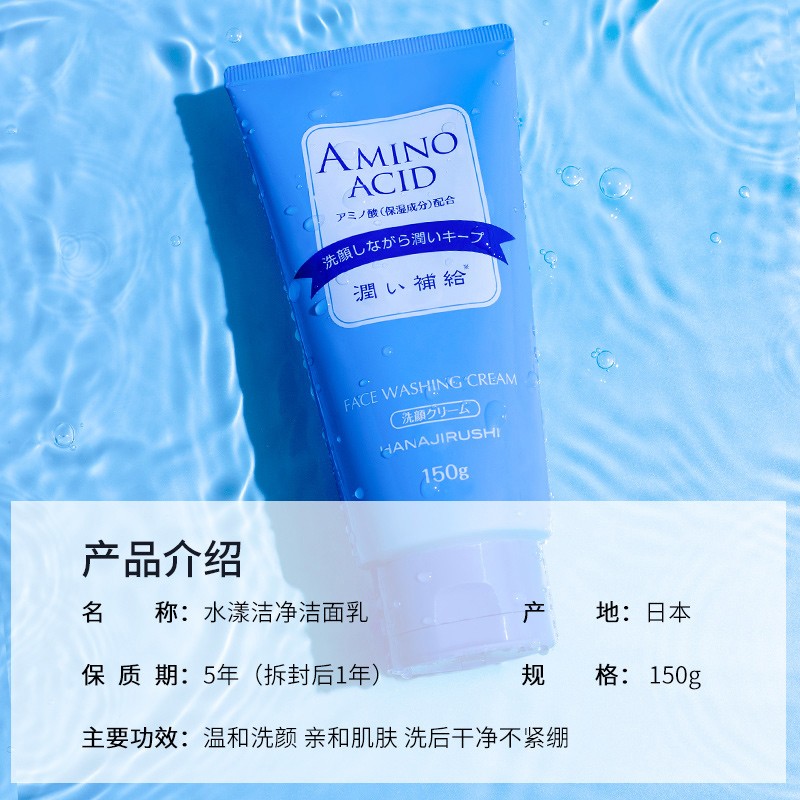 HANAJIRUSHI 花印 水漾洁净洗面乳 150g,泡沫丰富,添加了多种氨基酸降低刺激性,温和舒润,使用后清爽不紧绷,预防黑头的产生。