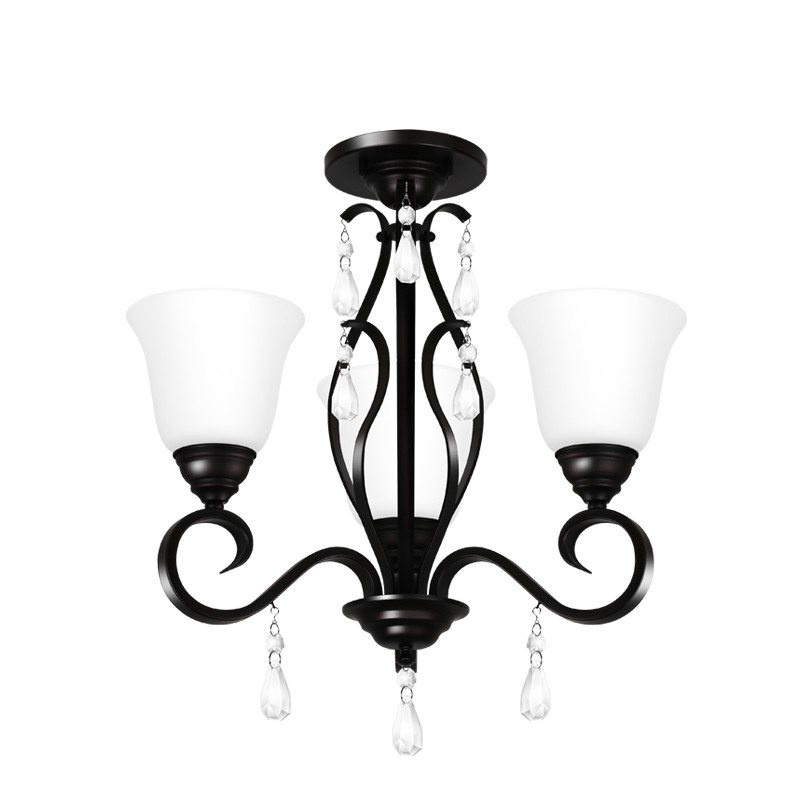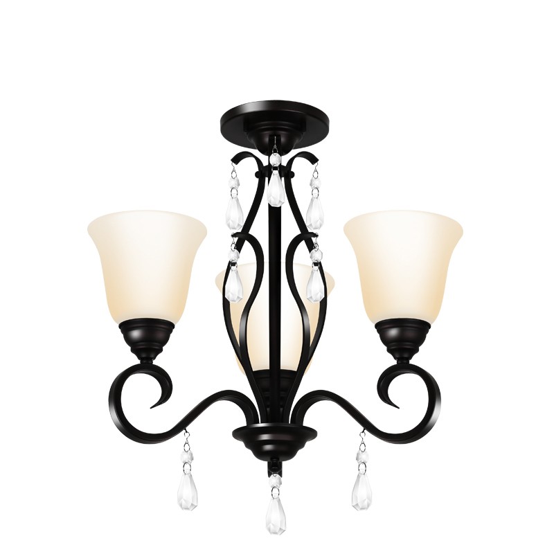 松下此款吊灯为美式乡村风格,采用乳白色玻璃灯罩,灯柱为高品质铁艺,一体化灯体灯臂设计,更具稳定性。防锈铁艺灯体光亮如新,防尘效果更佳。K9透明水晶为纯手工工艺制作,细腻美观,经久耐用不褪色。