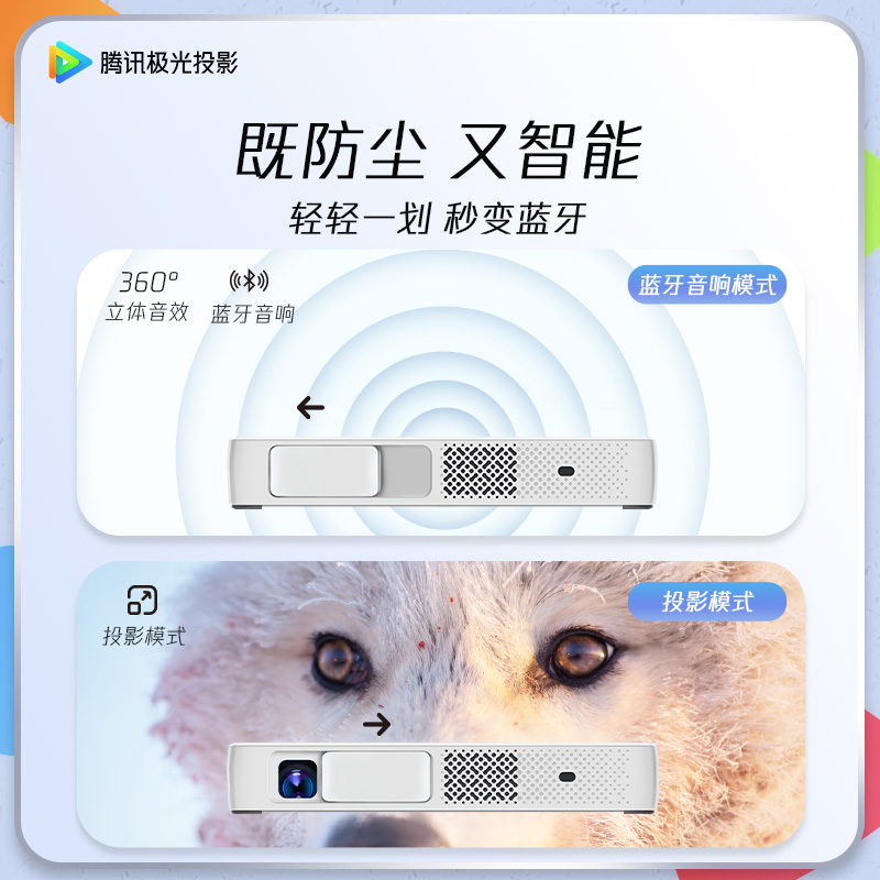 腾讯极光系列新款投影,主打移动便携。这款小白T1可以轻松放入背包中,重量仅为0.36公斤,并且内置锂电池,随时随地都可以投影,摆脱线缆的束缚。 在性能方面,腾讯极光T1采用DLP技术,原生分辨率为848X480,最大可兼容1080p画质。 功能方面,腾讯极光T1内置TOF激光对焦功能,可自动测量投影与投影画面的距离,及时对焦,保持画面清晰。另外支持HDR10解码,支持垂直梯形校正,内置的重力感应器,无需手动即可自动调整方形投影。该机还配备了上下35度梯形校正功能,解决画面变形的问题。 智能AI语音功能,配合遥控器即可使用,磁吸式滑动镜头盖,背包中也不会划伤镜头,并且支持待机蓝牙音箱功能。该机有着1.4:1的投射比,2.6米即可投射100吋大画面,可以体验投射天花板带来的沉浸体验。 腾讯极光T1配备智能语音遥控,内置腾讯语音智能系统,操作方便,正版片源、视频热门大剧实时更新。