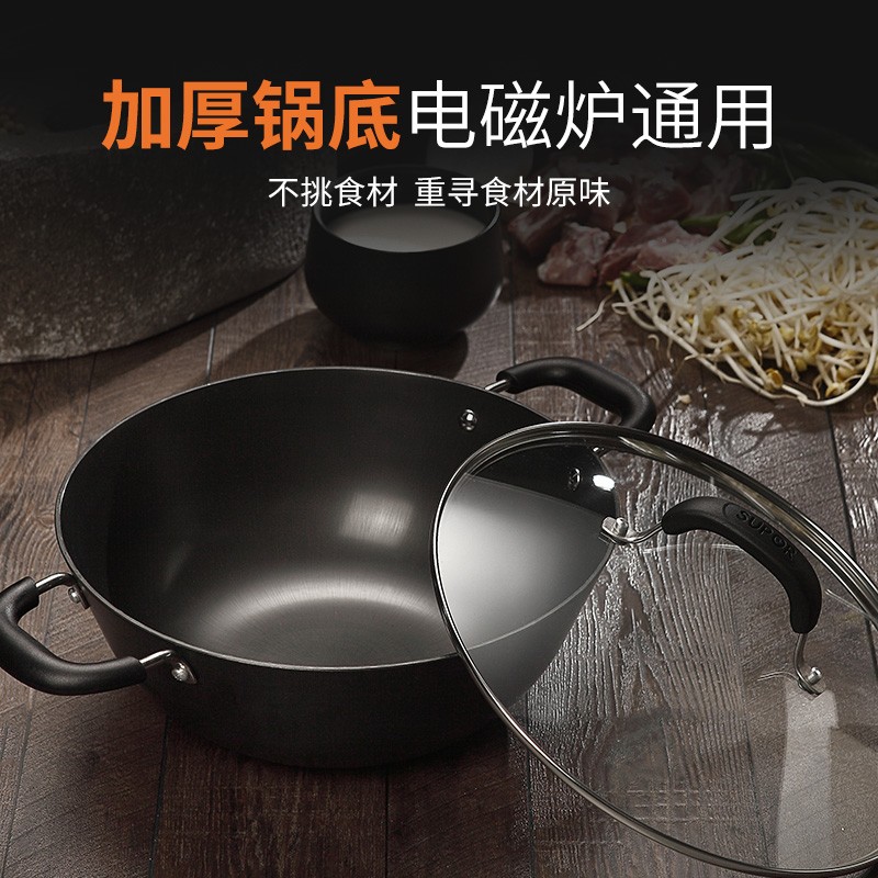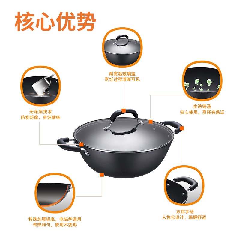 苏泊尔是国内知名厨具品牌,这款 铸铁双耳 无涂层深型 炒锅 36CM,采用99%高纯度生铁精铸,加深锅型,无涂层技术防刮耐磨,坚固耐用不变形,底厚壁薄,导热均匀,减少油烟。人性化双耳设计,端握更舒适,防止烫伤,适用于电磁炉、电陶炉、燃气灶等炉具。