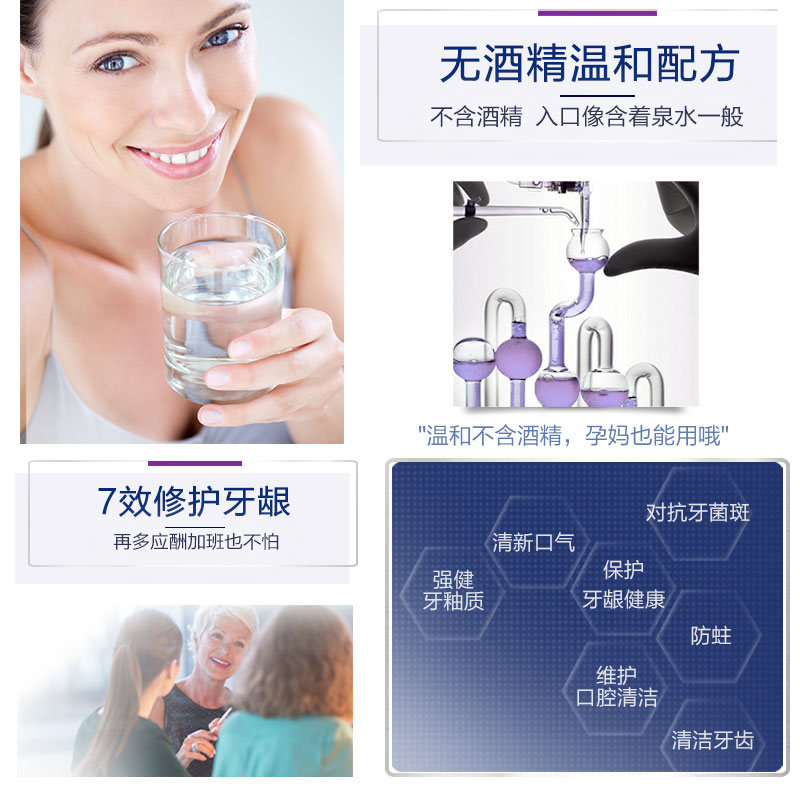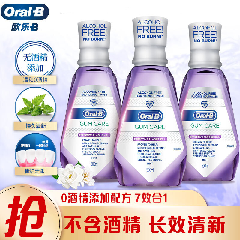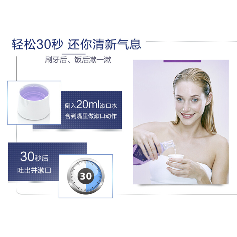 欧乐B(英语:Oral-B)是一个牙刷与其他牙齿护理产品(如牙线)品牌,由2005年收购了吉列公司的宝洁公司生产。Oral-B 欧乐-B 无酒精漱口水。这款漱口水最大的特色就是不含酒精,这对于口腔敏感的同学来说会非常合适,不用担心可能会刺激疼痛的问题。虽然不含酒精但是也都表现力非常的出色,它能深入清洁口腔内部难刷部位,杀灭隐藏在牙缝间及刷牙后残留的细菌,比单靠刷牙更能有效减少牙垢膜及牙龈炎的形成。使用方法:每次10-15ml的量(约半瓶盖的量),20-30秒后吐出即可。