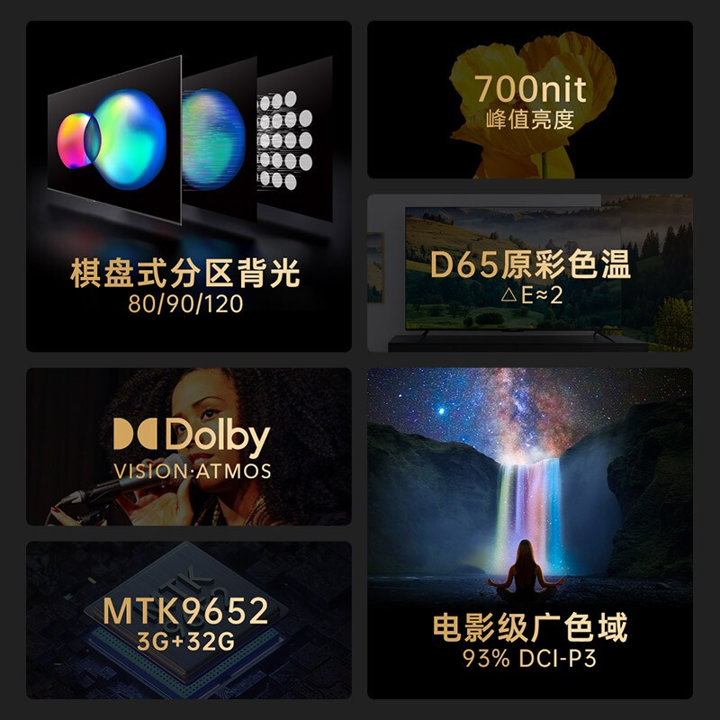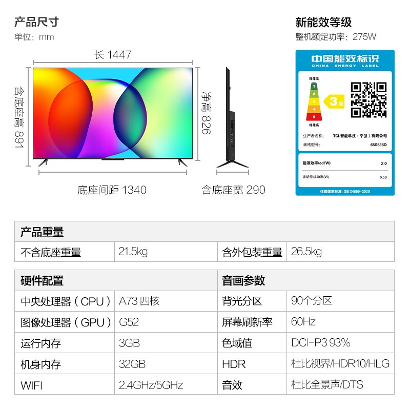 雷鸟S535D系列于2021年10月发布,包括55英寸、65英寸和75英寸三个尺寸版本,屏幕刷新率为60Hz,采用棋盘式分区背光55/65/75英寸分区背光数量分别是80/90/120,峰值亮度700尼特,拥有93% DCI-P3色域,色准△E≈2,支持MEMC动态补偿,拥有杜比视界和杜比全景声双认证;搭载四核A73+G52架构MTK9652处理器,3GB内存+32GB存储空间;提供HDMI2.1接口,支持VRR可变刷新率、ALLM自动低延迟;支持远场语音操控,外接摄像头可实现视频通话;全面屏设计,拥有超高屏占比。