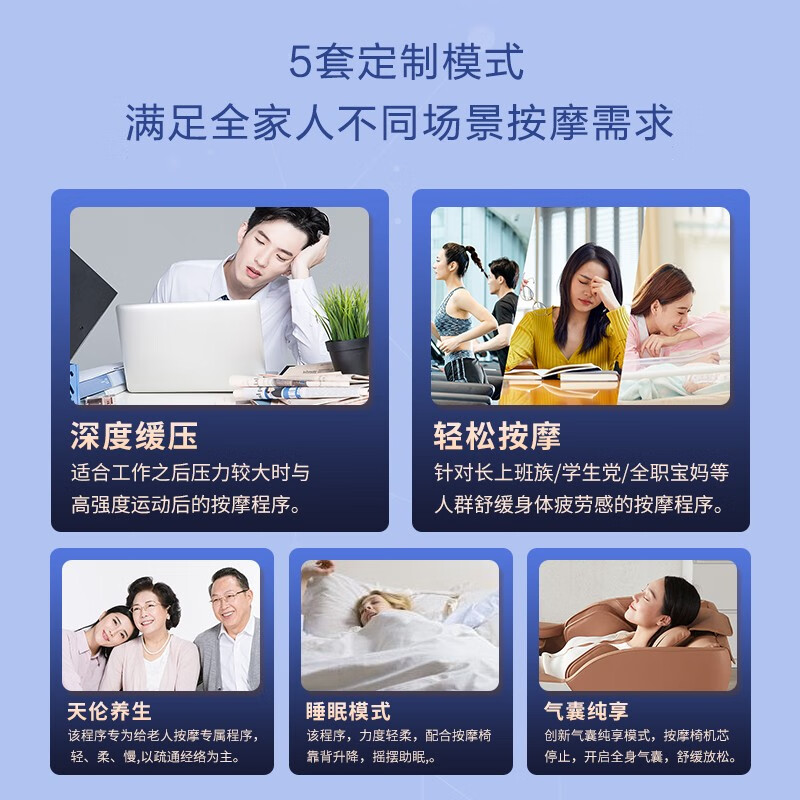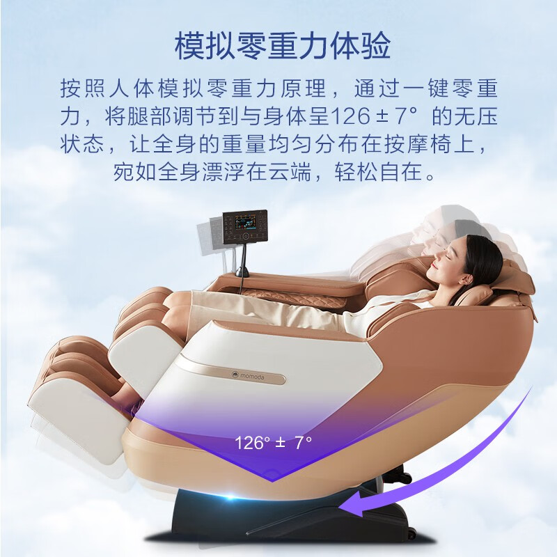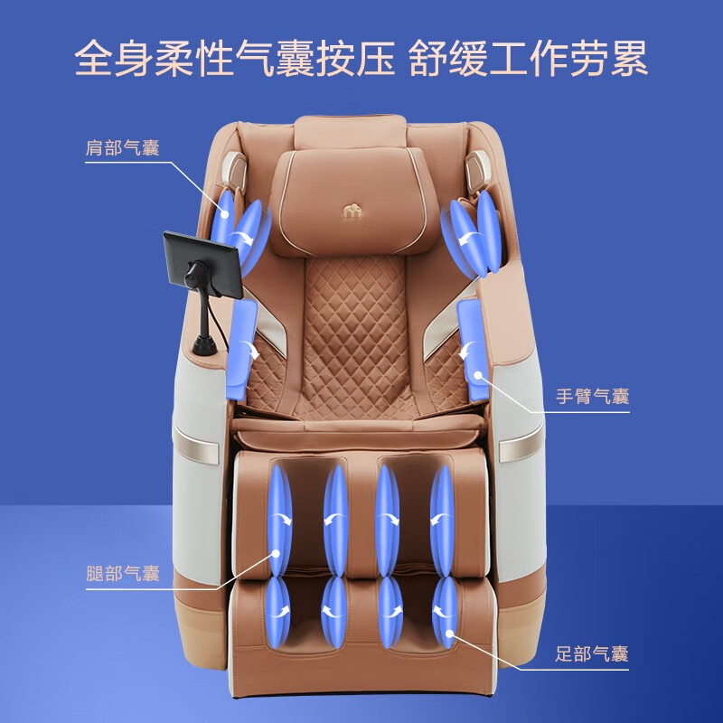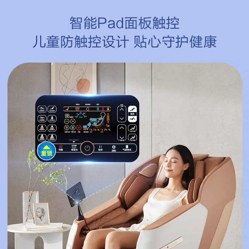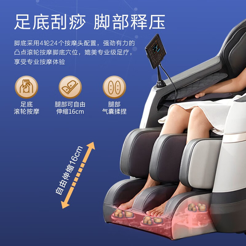 1.创新智能按摩机芯,全身22个按摩头,多部位同时按摩, 2.大尺寸平板操控更直观便捷 3.零重力太空舱 4.4套定制模式+1套气囊纯享模式 4.全身28个柔性气囊按压舒缓工作劳累,3档气压力度调节 5.腰部、腿部双重温感热敷 6.脚部采用4轮16个按摩头配置,凸点双涡轮盘按摩脚底穴位,3挡调节 7.蓝牙音乐 放松身心 8、安全童锁设计,避免儿童误触,保护家人安全 9、腿部16cm可伸缩适用不同身高