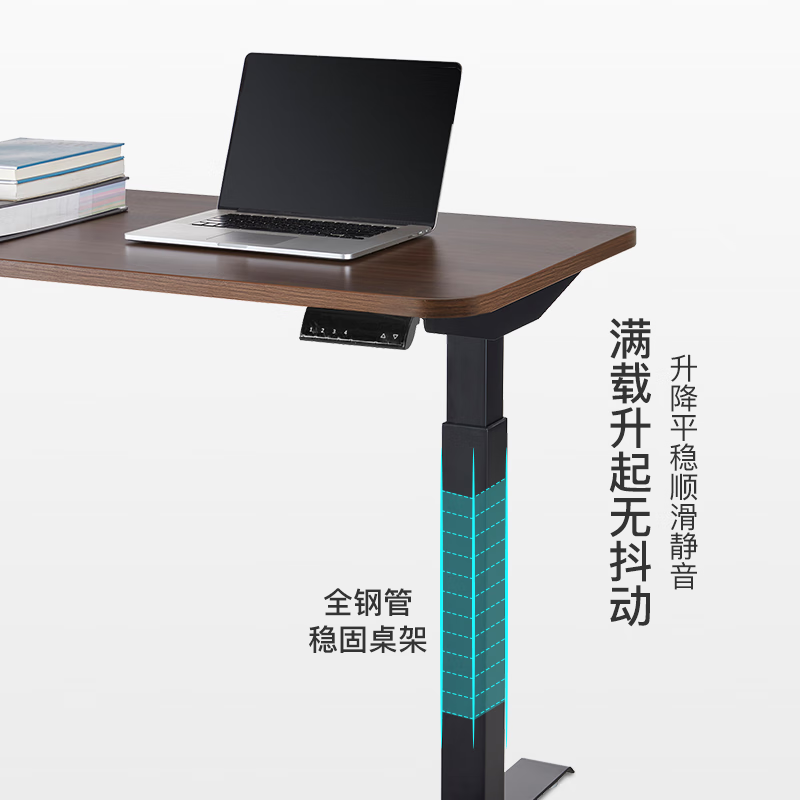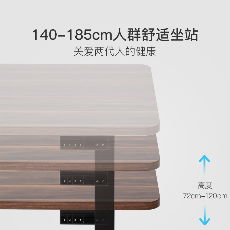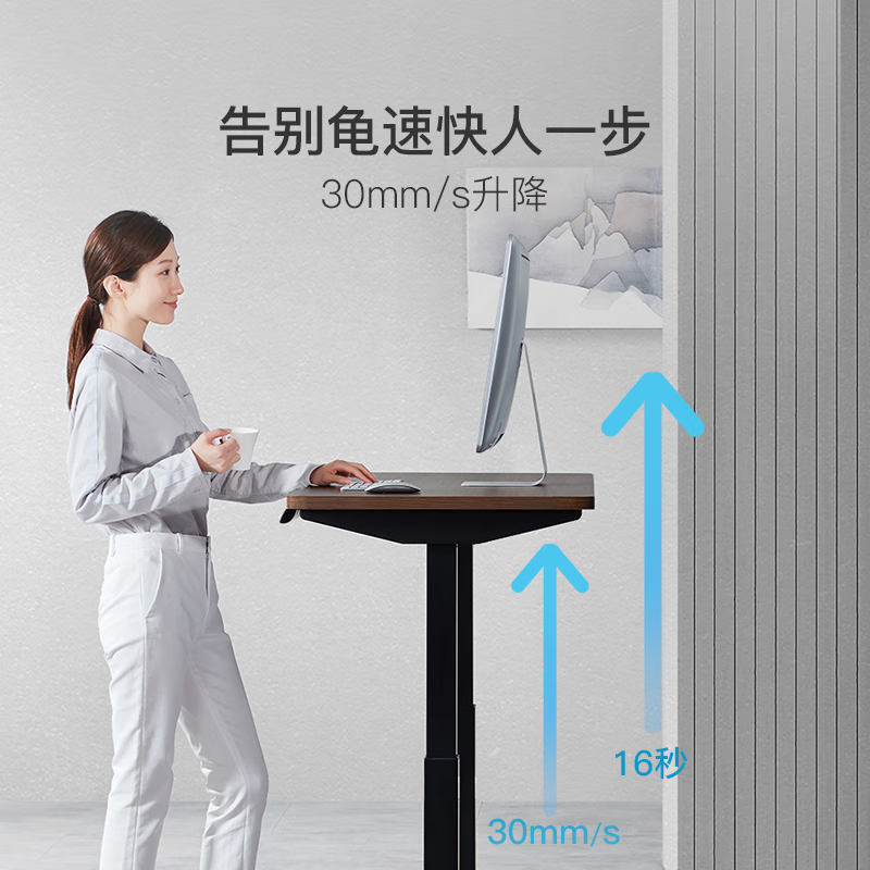 此款桌面的右侧是升降桌的功能按键区域,左右两端的箭头分别是可以控制桌子的升降,是屏幕上显示的数字为桌面实际高度,另外的1234以及s是高度记忆功能,升降桌可以同时存储4组数据一键调整高度。虽然是触摸式的按键,但是在点按操作的时候,都会有震动反馈,给人的感觉还是蛮高级的。桌腿采用了钢架材质,官方 宣称桌面最大乘坐120kg。桌子的升降高度从最低71cm一直可以升高至115cm。得益于双电机同时驱动以及智能芯片控制,升降过程文档匀速,这里我使用了快进播放,实际情况中桌子从最低到最高整个过程仅需12秒。