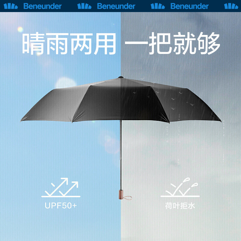 BANANAUNDER 蕉下 纯色双层防晒小黑伞,这款伞造型设计活泼小巧,伞面有阻隔UVA的L.R.C黑胶涂层,有效隔绝紫外线99%。加上双层伞布,人在伞下能有明显的体感降温,伞骨使用抗风结构设计,可承受风力约11m/s,磨砂质感的撞色手柄贴合手掌大小,触感细腻防滑,出彩的撞色搭配设计,让夏日防晒出行更加百搭随行。