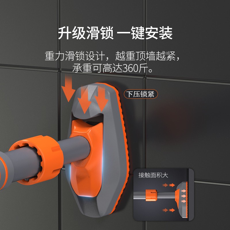 J.ZAO 京东京造 JZJYDG-001 引体向上单杠室内 70-96cm,京东京造燃.动系列产品,以灰橙色为主色系,为用户定制时尚有趣的健身体验。灰色寓意持久的精神,橙色象征生命的活力,沉稳与热情,融汇于极简线条的设计,赋予日复一日的坚持以快乐与惊喜。重力滑锁设计,越重顶墙越紧,承重可高达360斤。凹凸防滑纹理防滑条,接触面积大,更牢固更放心。