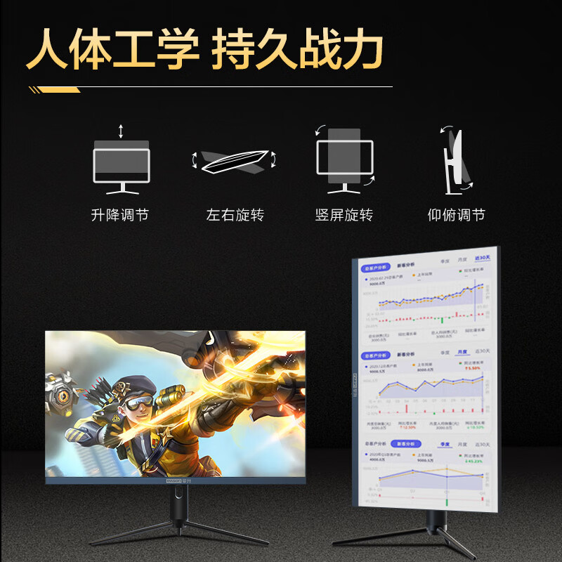 这款显示器采用新一代27英寸Fast IPS快速液晶技术,拥有2560*1440分辨率,支持HDR400,支持165Hz刷新率,拥有1msGTG响应速度,支持FreeSync技术,支持智能DC调光,显示器支架支持升降、旋转、俯仰调节。