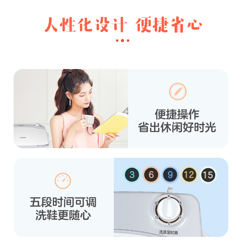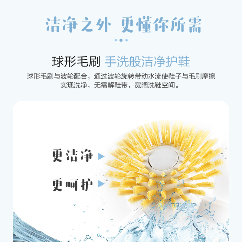 新创倾斜波轮,洗涤时形成旋涡式水流,全方位冲洗鞋面和鞋底,洁净更周全。大功率洗涤模式,轻松瓦解鞋面粘附的污渍,采用高品质尼龙毛刷,表面光滑,减少对鞋面材质的伤害,护鞋更耐用。一机两用洗鞋洗袜随心切换,装上毛刷是洗鞋机。拆卸毛刷是洗衣机。