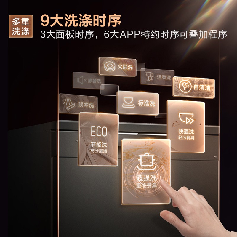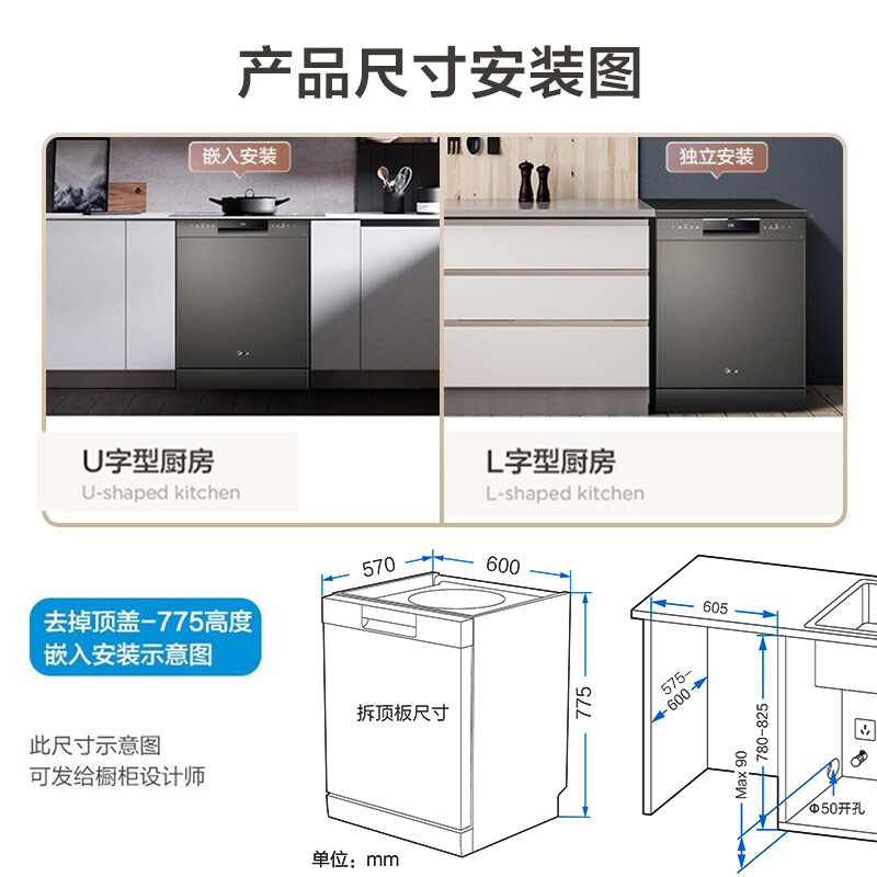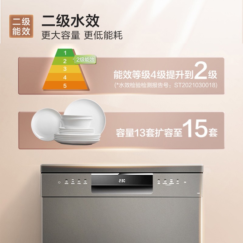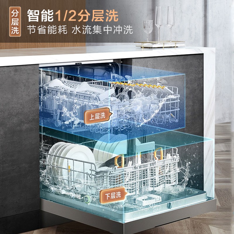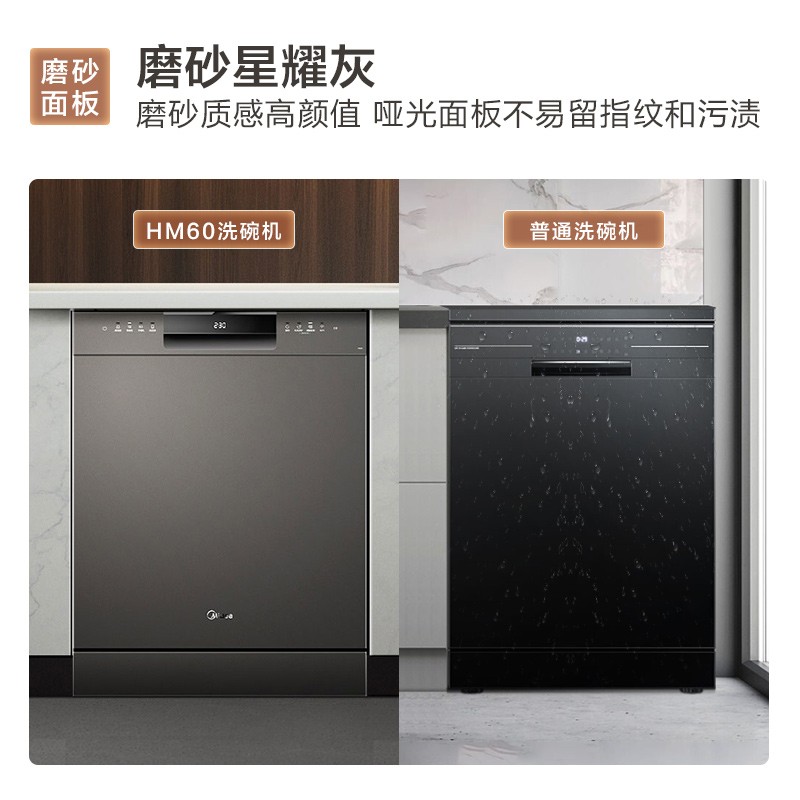 美的这款HM60 洗碗机 容量为15套,采用BLDC双驱变频电机,动力更加强劲,智能1/2分层洗功能,能够单独启动单层洗涤,水流集中冲洗,360°三层喷淋臂,二星消毒,杀菌率99.99%,双风机热风,PTC急送热风,防止湿冷导致的霉变,自带循环送风功效,72h长效储存,电机运行噪音44dB。9大洗涤程序,支持wifi互联。独嵌两用设计,产品尺寸:600*805*600mm