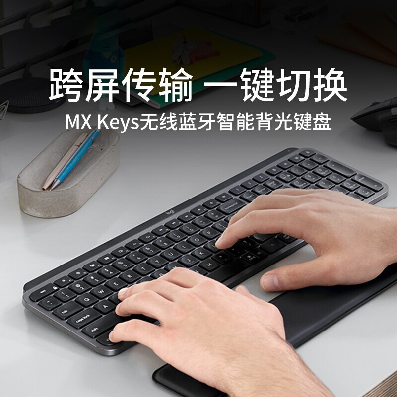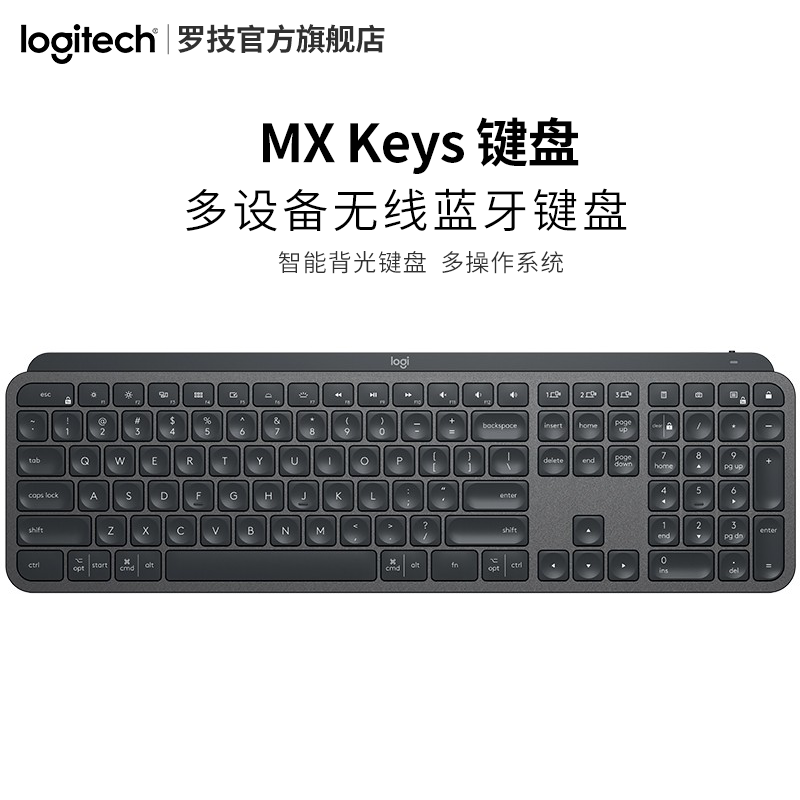 罗技MX Keys键盘定位办公使用,蓝牙和UNIFYING优联接收器双连接,带背光,手部接近传感器自动亮光,可自动调节背光亮度,球型凹面键帽,贴合手型,Easy-Switch键最多可连接三台不同设备。采用Mac版本键盘布局,Type-C充电口,完全充电后可使用10天,背光关闭续航最高可达5个月,尺寸为430.2mm*131.6mm*20.5mm,约重810g。