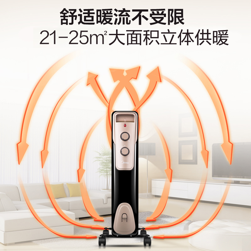 美的 NY2513-16JW 电热油汀取暖器适用面积25㎡,13片镂空散热片,双U速热管,高效导热油,3D立体加热系统,高温过热保护,30°倾倒断电,2200W功率,产品尺寸615*280*640mm。