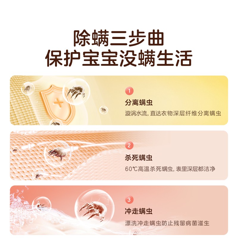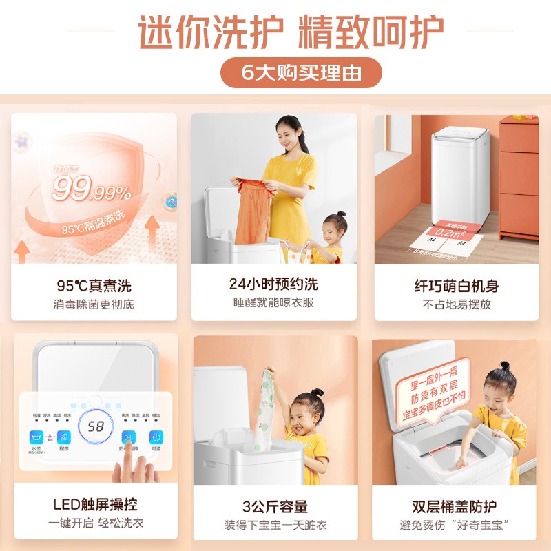 95℃真煮洗,持续高温煮洗,深入衣物纤维 全面杀菌,彻底消灭看不见的病菌。灵敏全触控玻璃屏面板,一键即可启智能洗护,配备 浸洗、快洗功能,轻松为妈妈洗衣減负。纤薄灵活小身材,与家无缝对接,易摆放 移动,经得起空间的考验。不锈钢内桶,洗衣后水流冲刷,去除桶壁 残留污垢,打造宝宝净衣空间,拒绝二次污染。