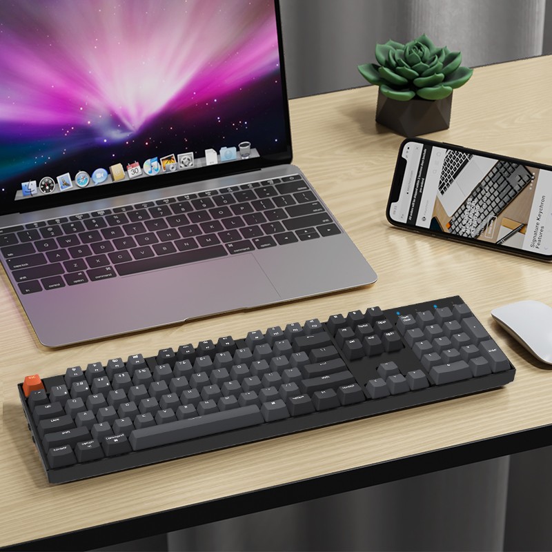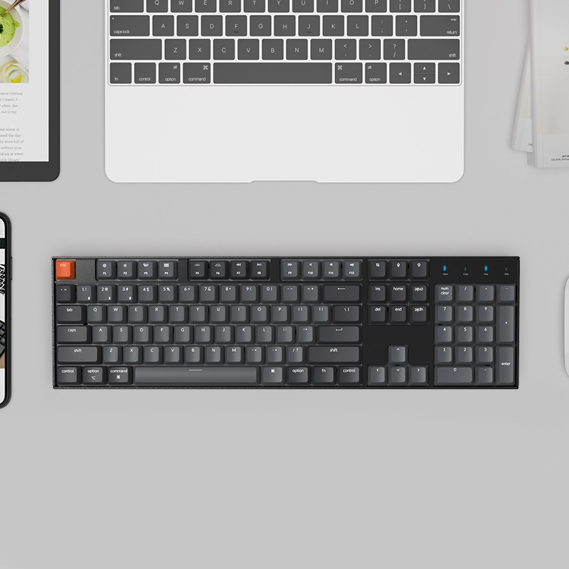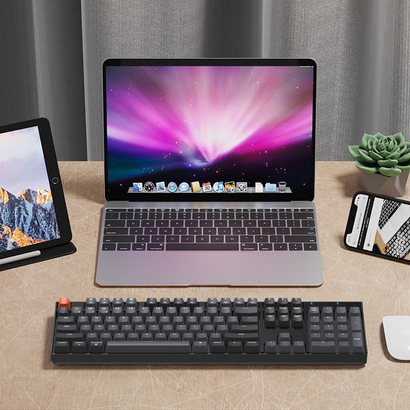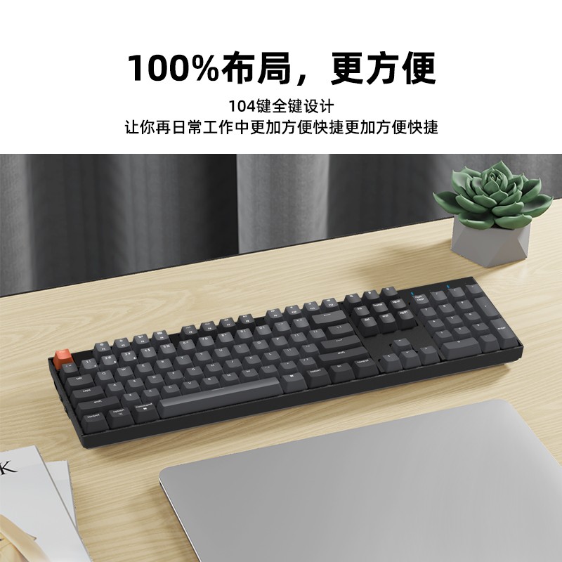 京造 k10机械键盘配列为104键(100%)布局。轴体为佳达隆茶轴,总键程4mm,触发键程2mm,触发压力55g。连接方面有线、蓝牙双模链接。续航方面拥有4000mAh超大容量锂电池,充电6小时,使用时间80小时,最长使用时间可到3-5周。同时适配3台设备可快速切换,使用Fn+1/Fn+2/Fn+3快速切换所需设备。