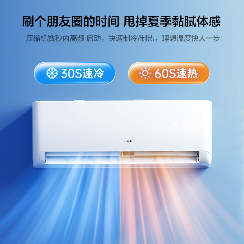 TCL净怡风系列壁挂式空调有大1匹和1.5匹两种规格,采用R32冷媒,APF值为5.26,符合新一级能效标准;支持健康自清洁功能,蒸发器持续56℃高温烘干自清洁,同时采用易拆结构设计,让导风板可轻松取出,同时便于对风轮进行清洗;采用双层导风板设计,送风范围更广;支持TCL+ APP操控,除了各项操控功能,还能查看空调的耗电情况。