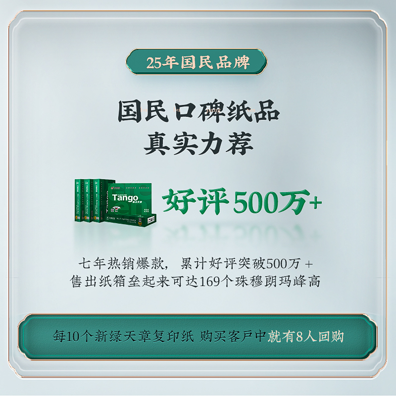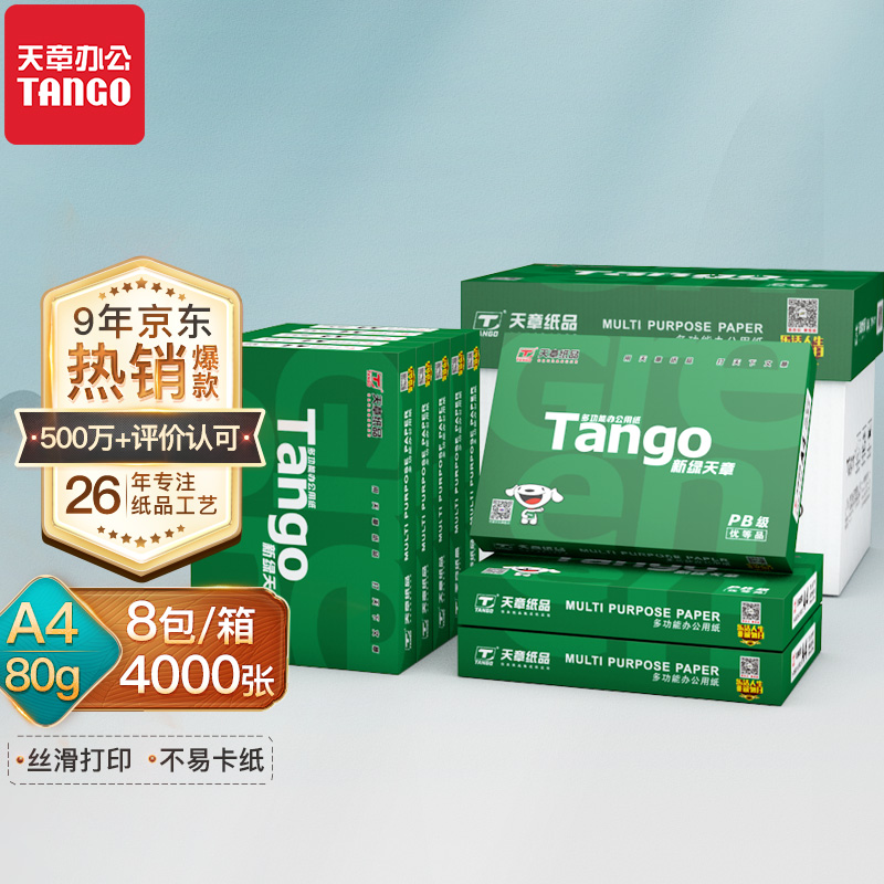 TANGO 天章 新绿天章A4复印纸,80g,采用100%纯木浆纤维原料,纸面光滑。规格500张/包,共8包。京东的用户评价颇高。