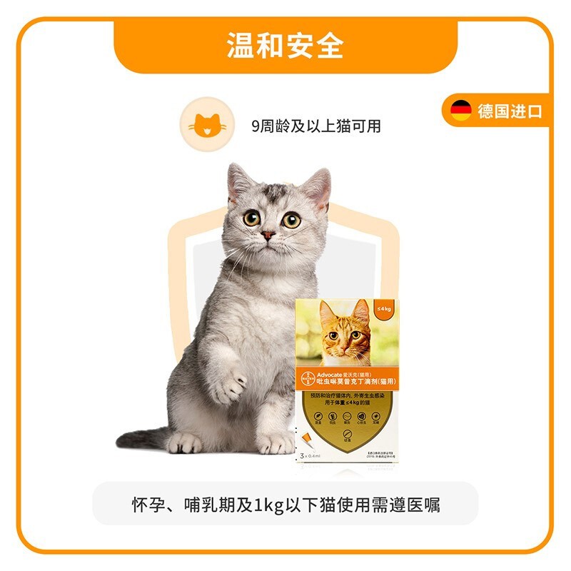 内外一体驱虫滴剂,适用9周龄以上,体重≤4kg的猫咪。