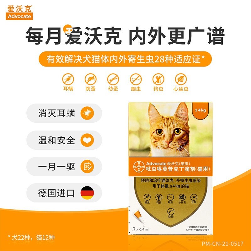 当前的位置: 首页 > 今日值得买 > 拜耳爱沃克猫体外驱虫猫咪体内外一体驱虫药小猫幼猫成猫外驱去耳螨跳蚤药除蚤去猫虱猫蚤爱沃克爵氏 0.4ml(≤4kg猫用) 3支装