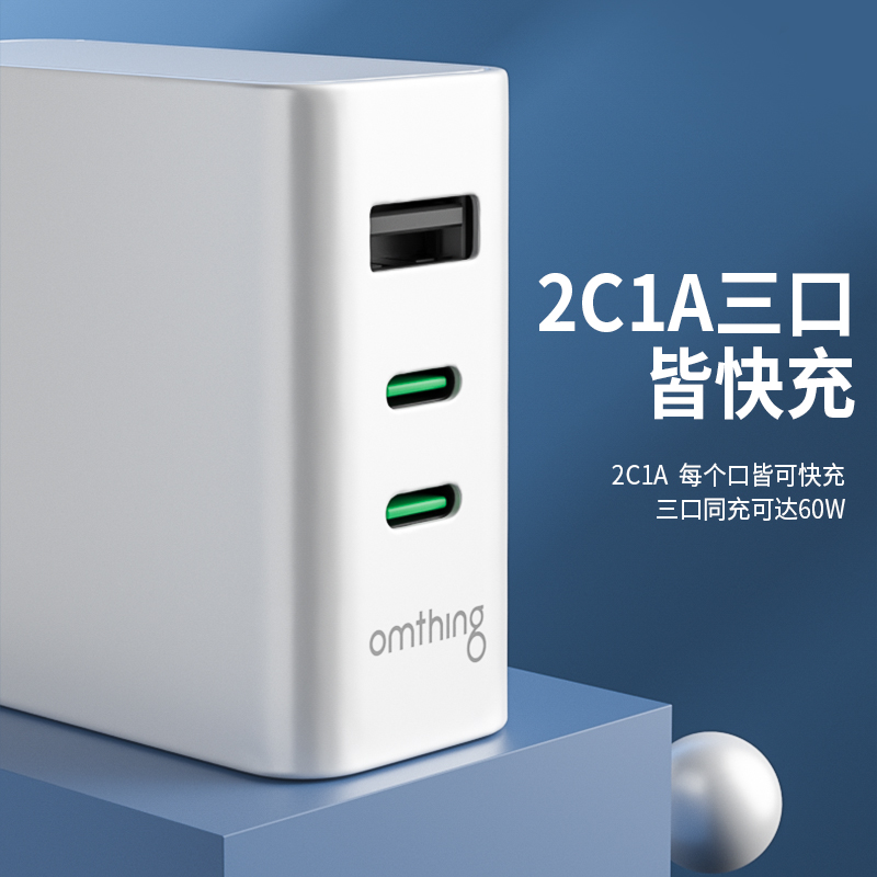 OMTHING这款笔记本PD充电器,采用氮化镓GaN第三代黑科技导体材料,与传统充电器比体积更小、重量更轻、效率更高。升级智能芯片,自动识别机型和快充协议,2个typeC+1个USB-A接口,每个口皆可快充,三口同充可达60W。内置硅胶导热片及GaN能效芯片,杜绝传统氮化镓易发烫的情况,保护机身电池,延长电池寿命。
