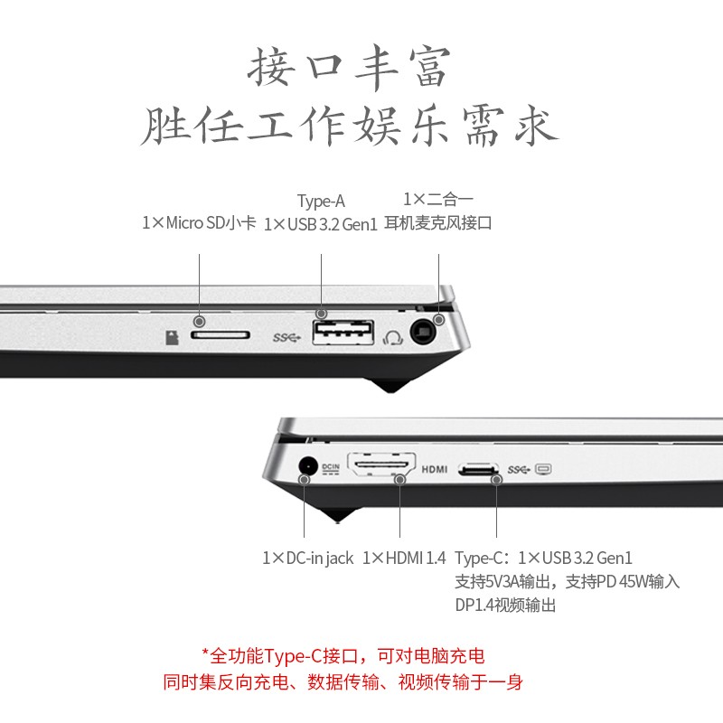 外观方面,三面金属机身,航天铝合金冲压一体成型,CNC钻切高光设计,工艺精雕细琢,彰显金属质感,日极氧化工艺着色持久耐磨耐腐蚀。轻量化设计,轻约1.39kg,薄约 16mm,简约设计。屏幕方面,边框采用 5mm 微边框设计,全面屏视觉体验,屏占比高达 83%,支持 180°大开合角度。搭配 14 英寸 IPS 显示屏,1080P 高清分辨率,可视角度 178°。配置 720P 高清摄像头。