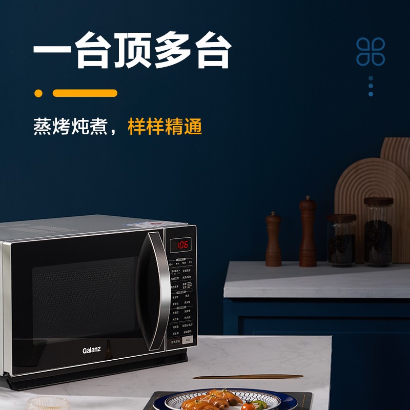 这款微波炉采用900W大火力,3D立体加热,变频解冻技术,一键蒸汽清洁功能。一级能效,节能省电,智能菜单,一键制作美食,智能变频,不同食材匹配不同火力,微晶加热面板,磐石底座,高清显示屏,安全双排风。产品容量23L。产品尺寸:287*490*354mm。