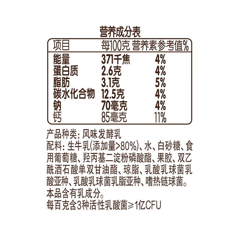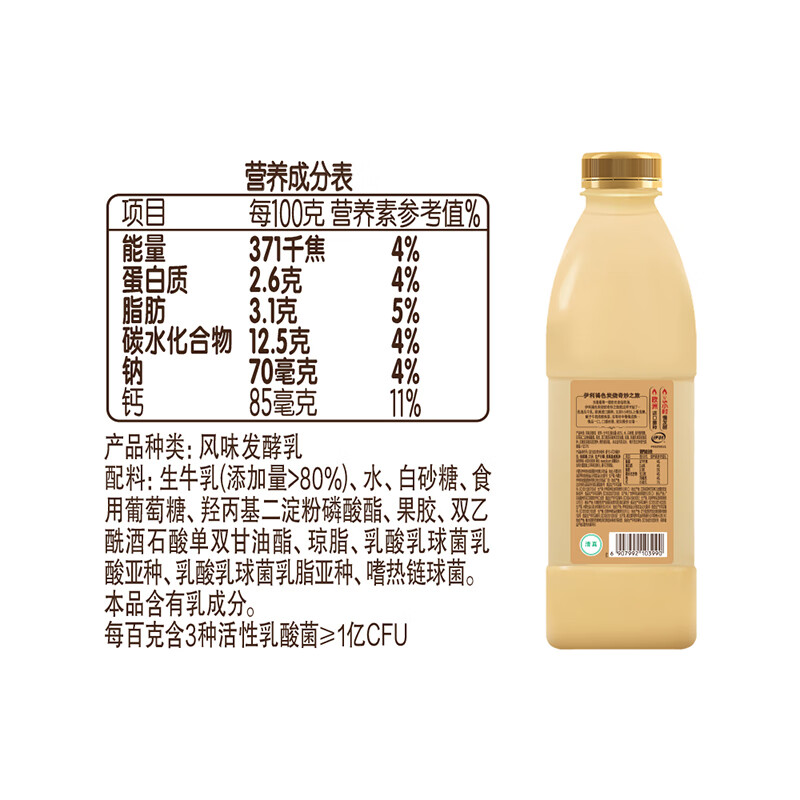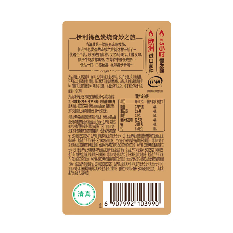 伊利是内蒙古伊利实业集团股份有限公司旗下主打品牌,起源于1956年并于1993年在内蒙成立。产品线涵盖纯牛奶、冰淇淋、奶粉、酸奶等多个品类。这款褐色炭烧酸奶从配料表上看没有色素,那就应该是经过美拉德反应(焦化)处理过再发酵的发酵乳,口感浓厚醇滑,规格:1.05kg。