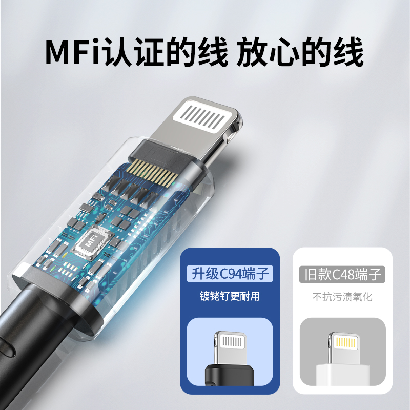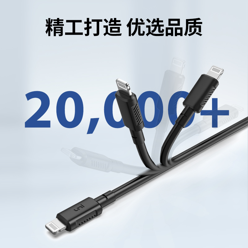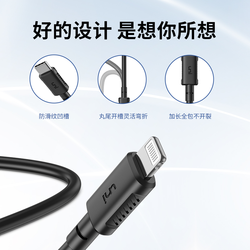 uni 苹果MFi认证Type-C转Lightning PD快充数据线,使用苹果C94端子,具备MFi认证,支持PD 20W快充,亲肤TPE材质,插头设计有防滑纹路凹槽更易插拔,强化全包丸尾防断裂,超长1.8米无约束