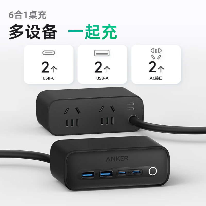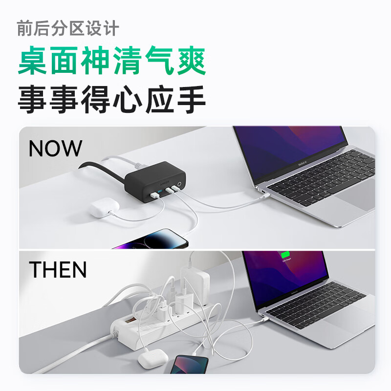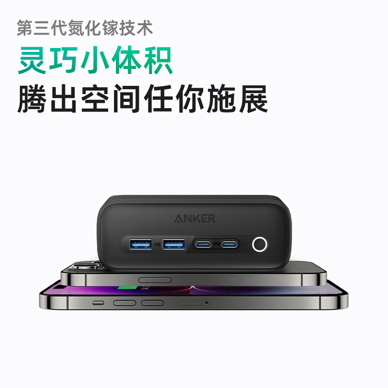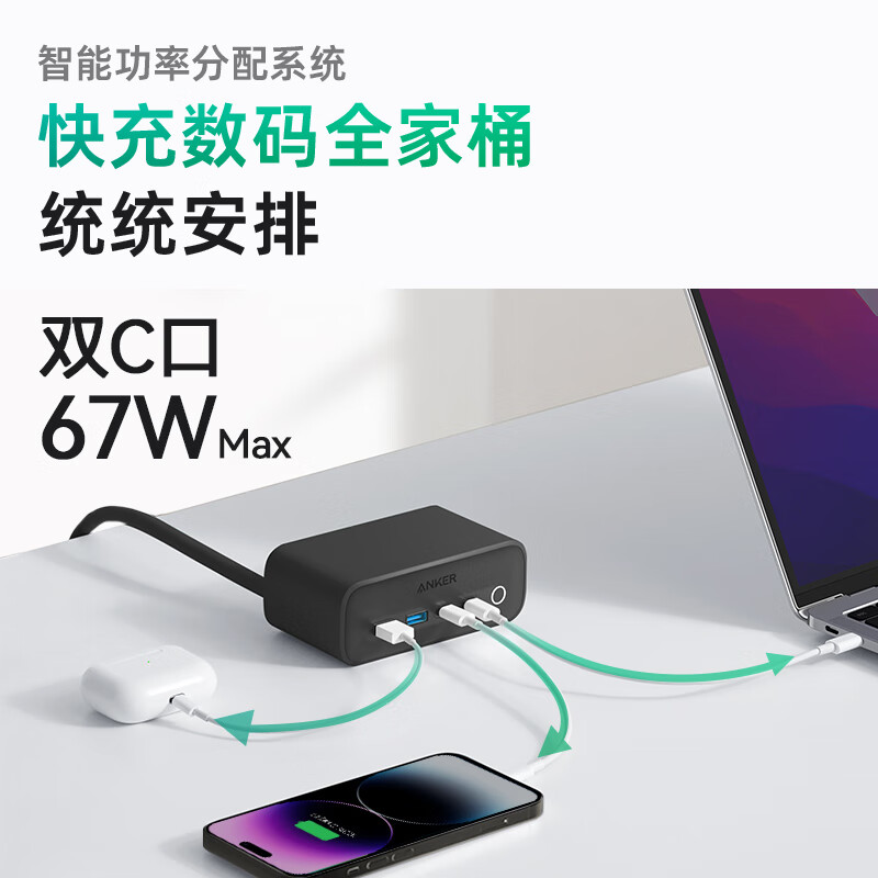 安克 525 67W全氮化镓充电器拥有前双USB-C和双USB-A接口、后双AC接口,充电器采用全接口氮化镓技术,最高可达67W快充。USB-C输出最大67W功率,USB-A输出单口最大12W功率,双口最大15W功率。充电器采用全新升级A温控2.0,每秒测温40次,300J浪涌保护,电流更平稳,全方位守护充电安全。充电器采用前后分区设计,常用的USB口分布前侧,方便随时拔插,不常用的AC口隐藏在背面,优雅整洁,告别繁琐理线,凌乱桌面瞬间清爽。