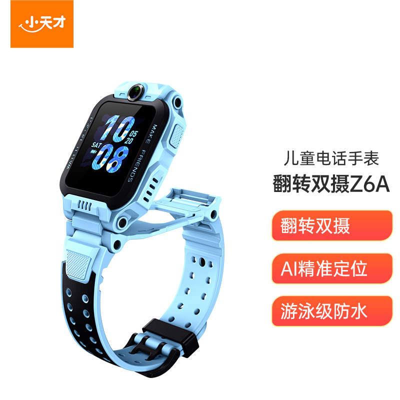 小天才 Z6A 4G智能手表,支持翻转双摄,前后视频均支持高清,视频来电支持家长预览、可远程切换摄像头,AI精准实时定位,多维度守护,支持移动扫码支付,游泳级防水,4G网络清晰稳定,760mAh锂电池提供长续航。