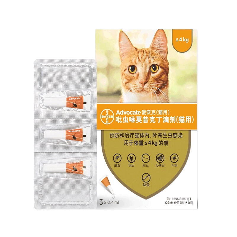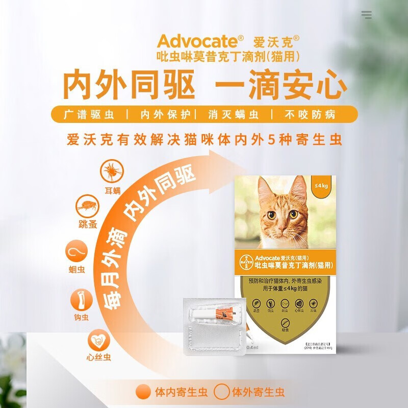 当前的位置: 首页 > 今日值得买 > 拜耳爱沃克猫咪驱虫药体内体外驱虫滴剂打虫除耳螨虱子跳蚤蛔虫钩虫小猫成猫幼猫 【小于4kg猫】内外同驱3支