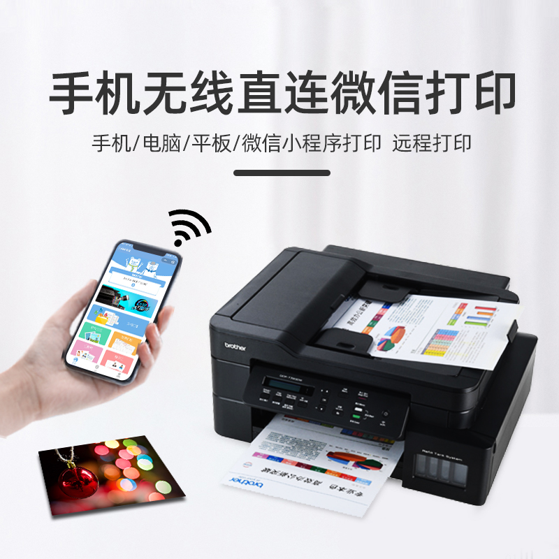 Brother 兄弟 DCP-T725DW 喷墨一体机是兄弟于2020年推出的新款连供大墨仓机型,内置连供墨仓,可方便快捷的直接加墨,支持打印、复印、扫描等功能,支持兄弟畅享印小程序打印,摆脱app束缚,照片、文档(pdf、word、excel等)等可直接使用小程序进行无线打印。DCP-T725DW的黑白打印速度高达30页/ 分钟, 彩色26页/ 分钟, 打印分辨率最高达1,200*6,000dpi。搭载20页自动输稿器,支持自动双面打印,可大大节约纸张成本。150页全封闭纸盒设计,防尘防潮防卡纸保证了打印的连续性提高了工作效率。 使用方面,配备自动输稿器,可支持最多20页文件的连续复印、扫描,省去来回摆放的重复动作。标配单张进纸,人性化直通纸道设计,方便打印厚纸。