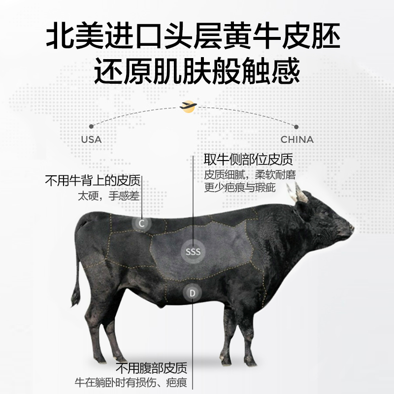 北美进口头层黄牛皮胚,仅使用圈养黄牛,且选用公牛30%-50%的黄金部位,纹理清晰细腻,疤痕与瑕疵更少。