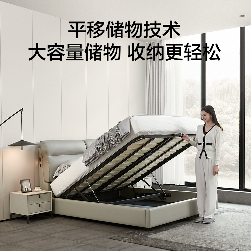 平移储物技术,区别于市面单气动杆结构,本产品使用双气动杆,开合顺畅,操作便捷,解决小户型收纳难题。